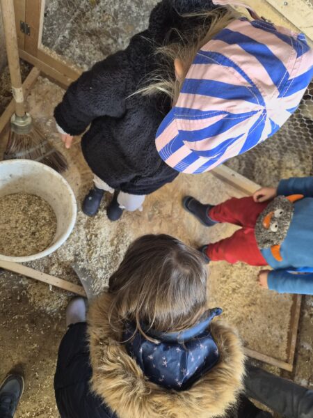 Dès leur arrivée, les enfants ont été plongés dans le quotidien de la ferme en participant à de véritables petites missions de soigneur. Avec beaucoup de sérieux (et parfois quelques éclats de rire !), ils ont nourri les poules, les poussins et les canards, tout en veillant à leur apporter de l’eau bien fraîche. Un groupe a même eu la chance de participer au nettoyage de la cage des cailles : enlever les fientes et remettre une litière toute propre… un travail important pour le bien-être des animaux, accompli avec beaucoup d’implication !