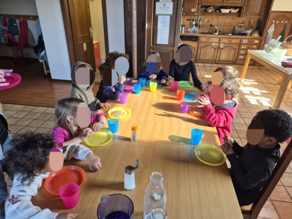 Autour de la table, les enfants se sont glissés dans la peau de petits cuisiniers. Chacun leur tour, ils ont participé à la préparation de la pâte à crêpes : casser les œufs, mesurer le lait, peser la farine et bien sûr… mélanger avec énergie ! Un moment riche en découvertes et en fierté.