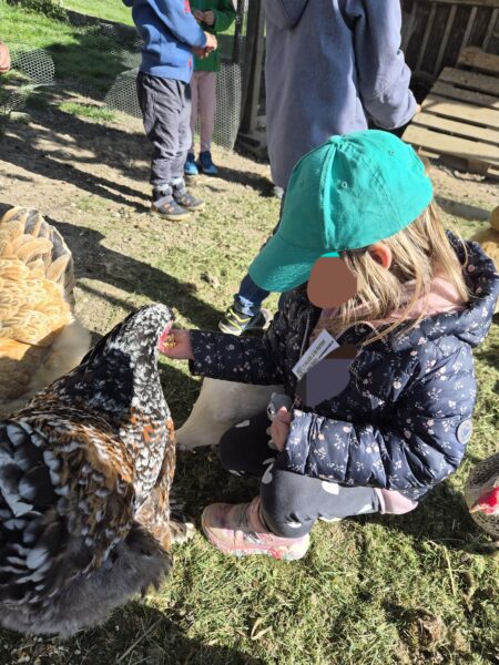 Pendant ce temps, le second groupe est parti à la rencontre des poules à mes côtés. Au programme : nourrir, donner à boire, observer le poulailler et comprendre comment vivent les poules au quotidien. Les enfants ont aussi eu la joie de ramasser les œufs, un moment toujours très attendu !