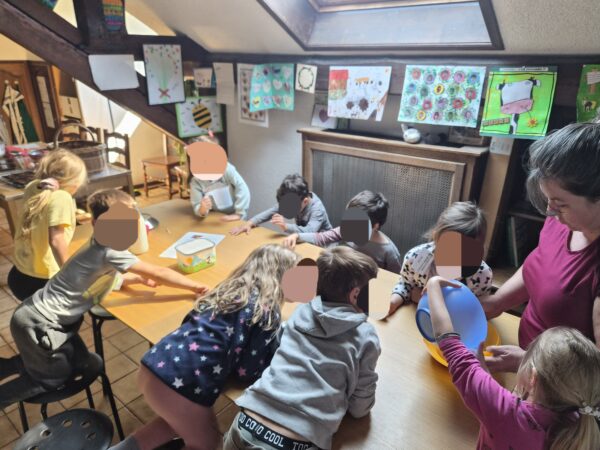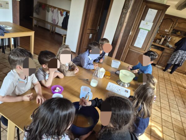 Puis, direction la salle pour un atelier aussi gourmand que participatif : la confection de madeleines ! 🧁 À partir des œufs fraîchement récoltés, les enfants ont mis la main à la pâte : casser, mélanger, peser, mesurer… chacun a contribué avec enthousiasme à la préparation.