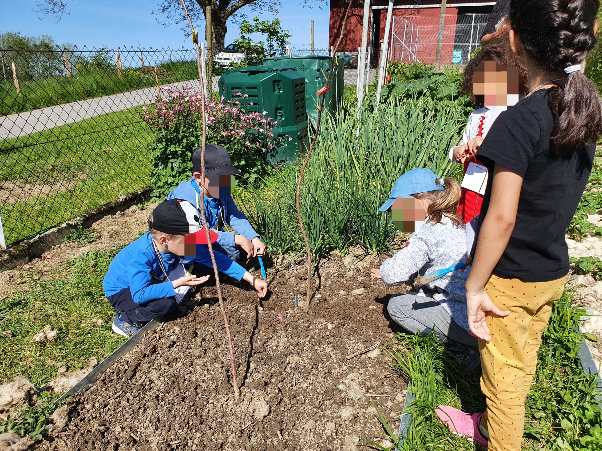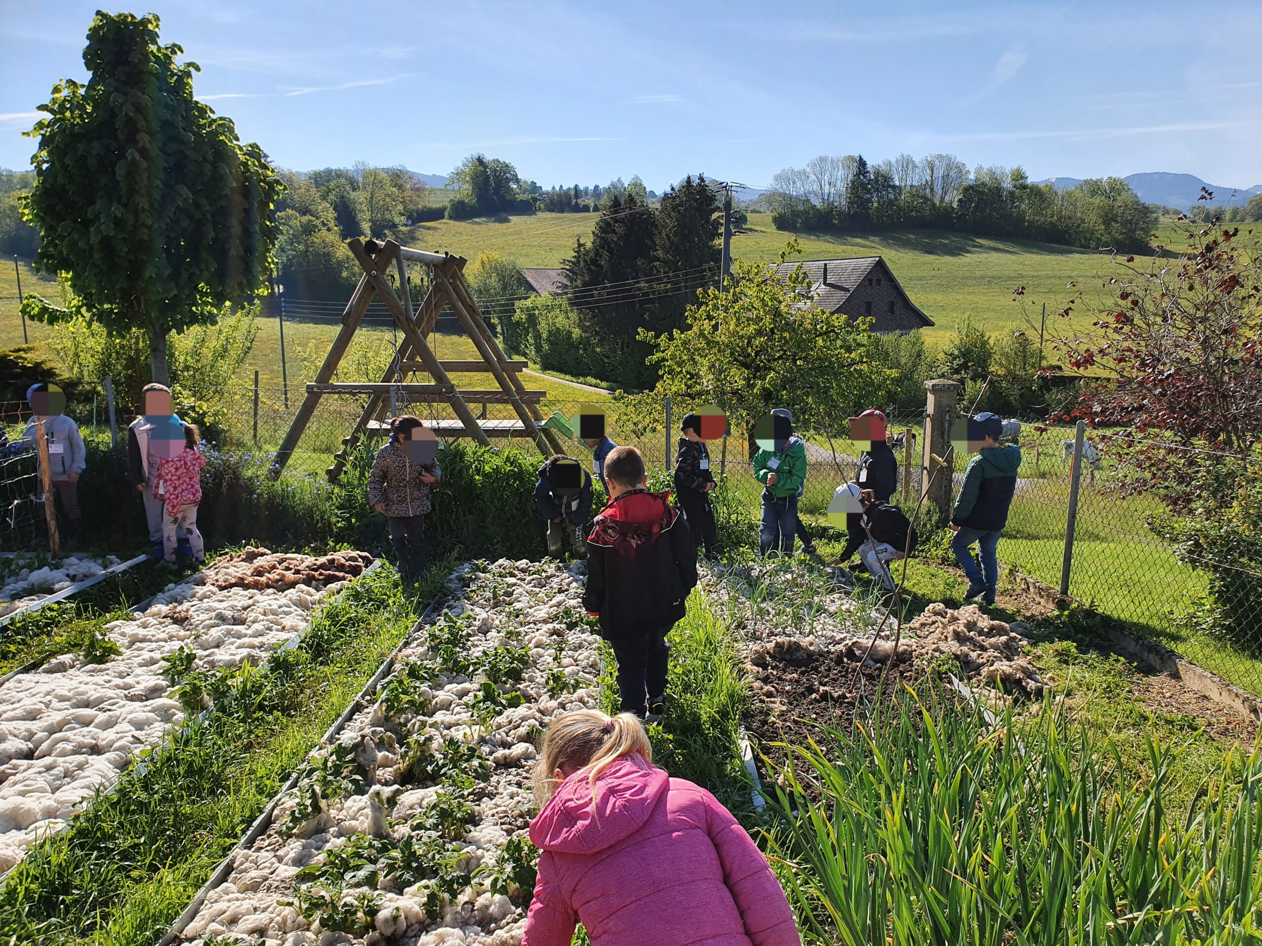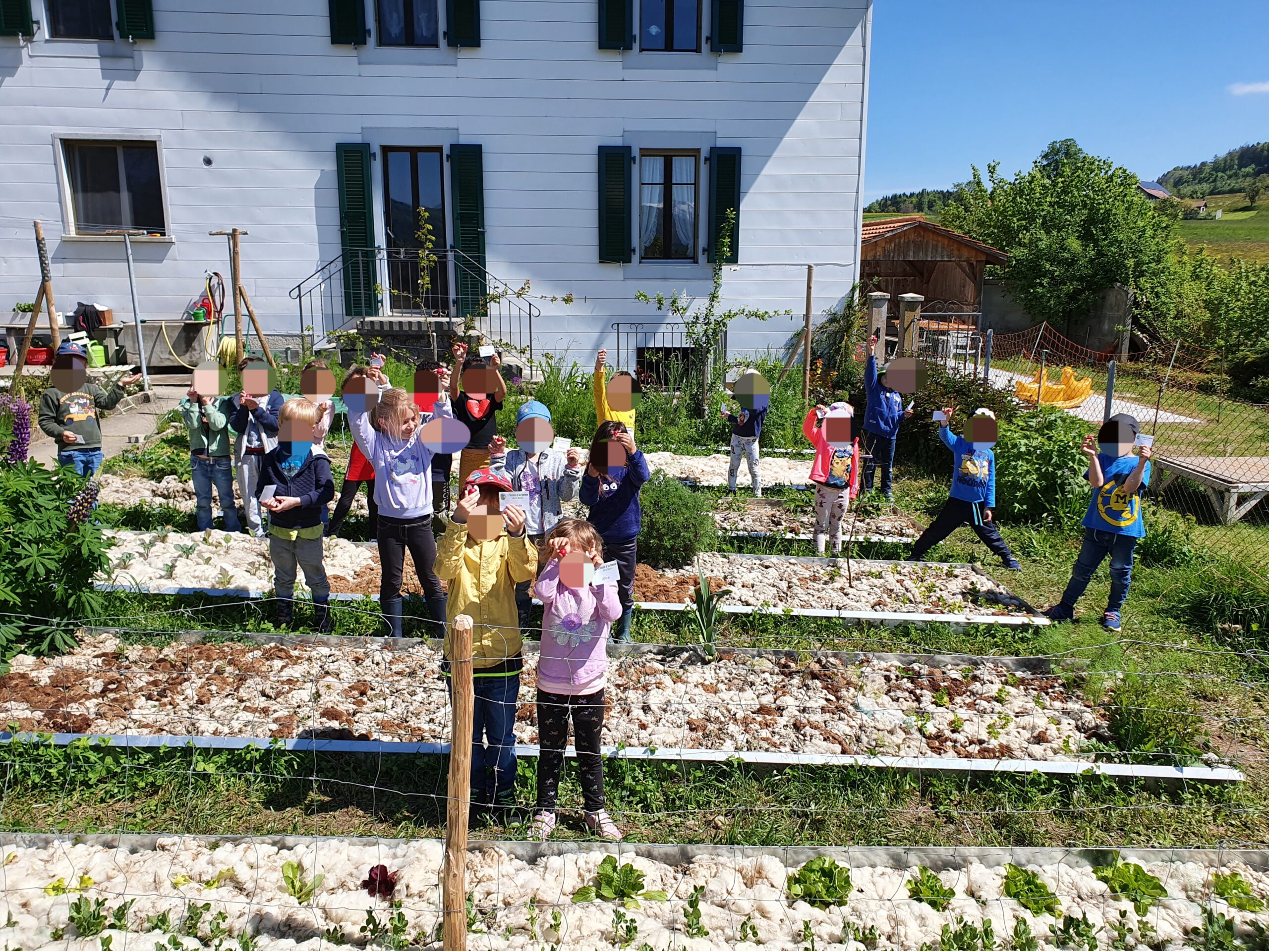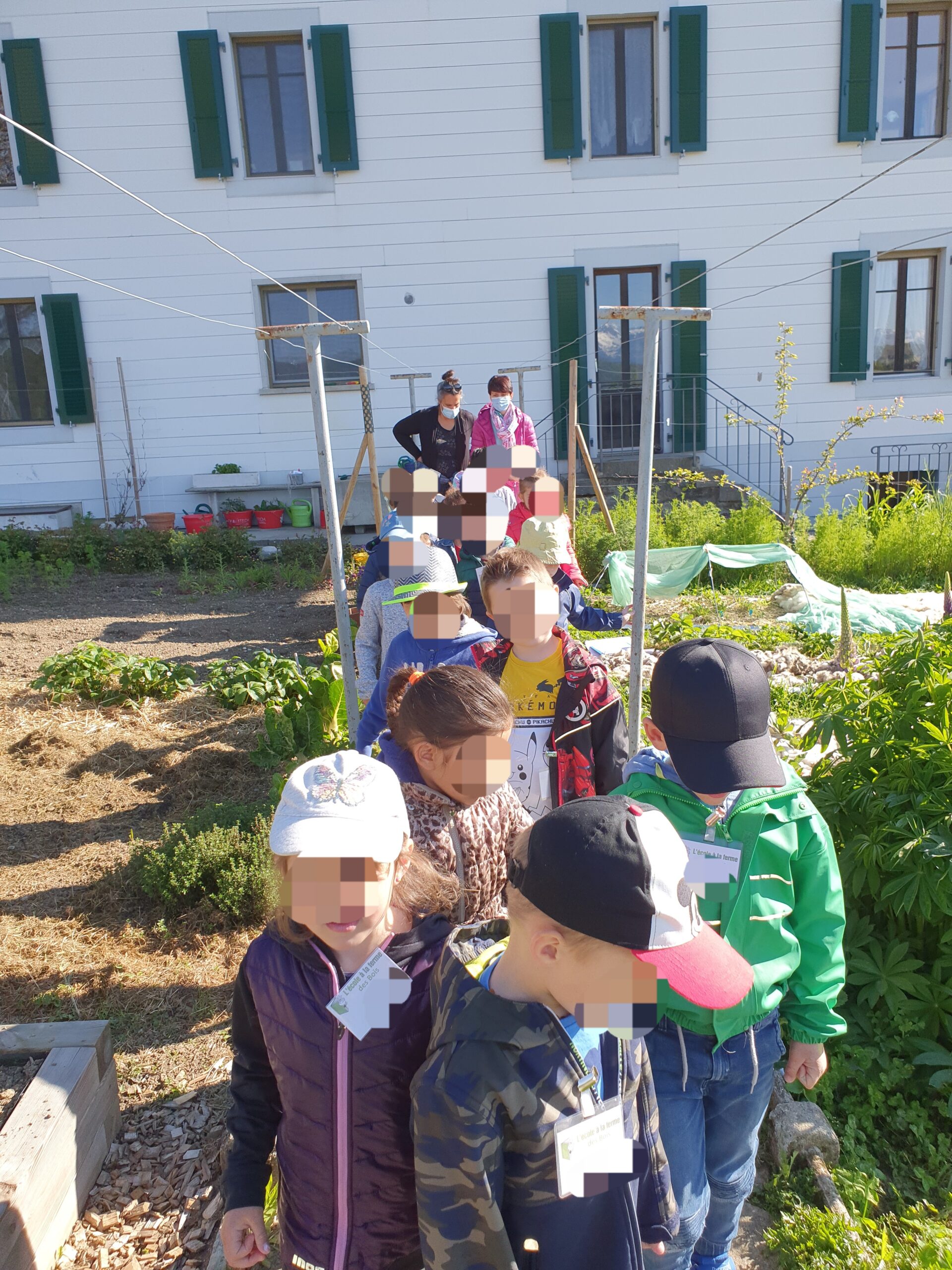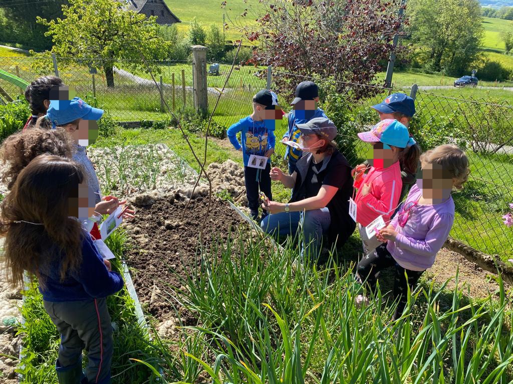 Ce vendredi matin, les élèves 1-2P de Annik Colomb sont venus découvrir le potager.