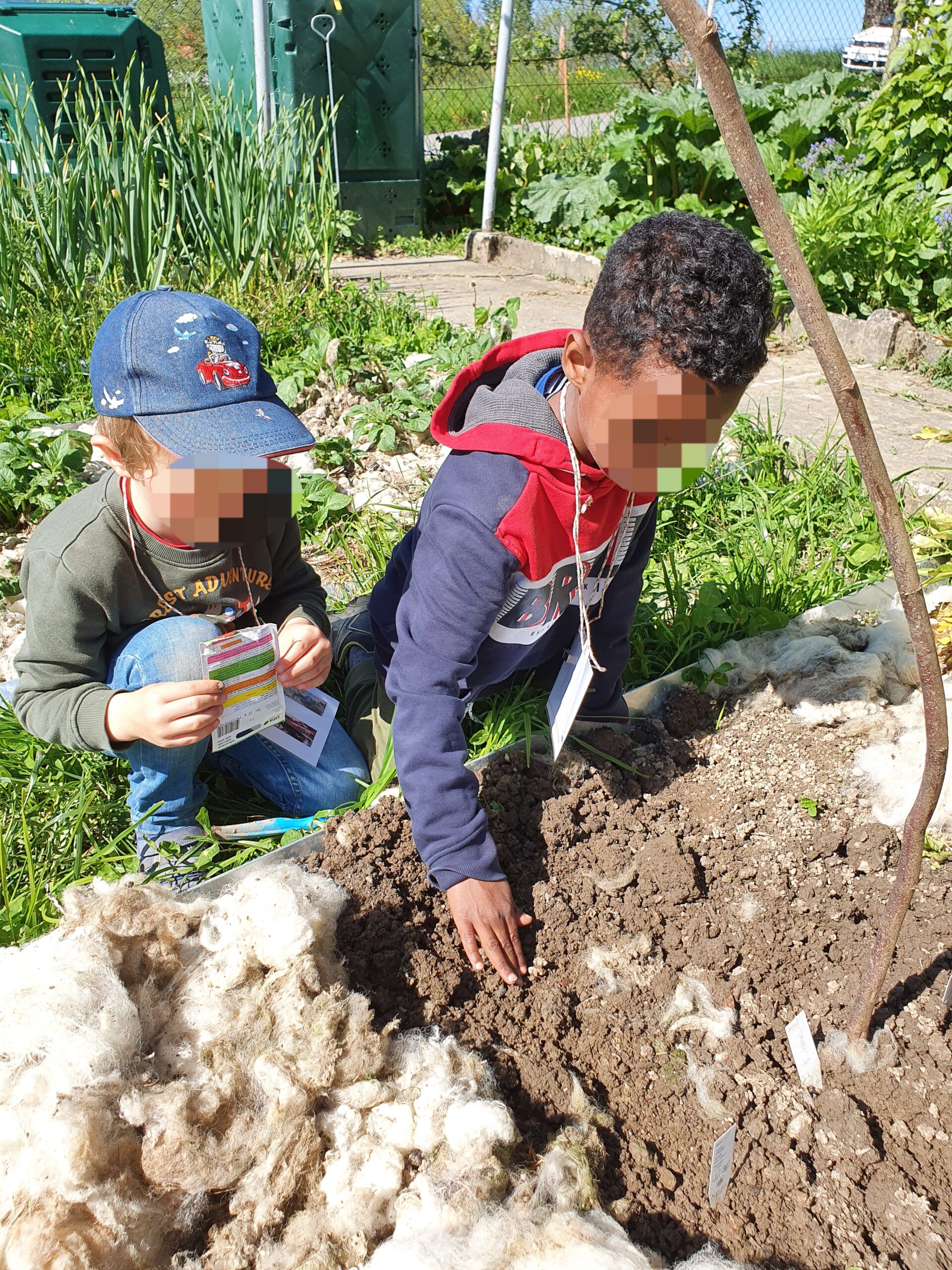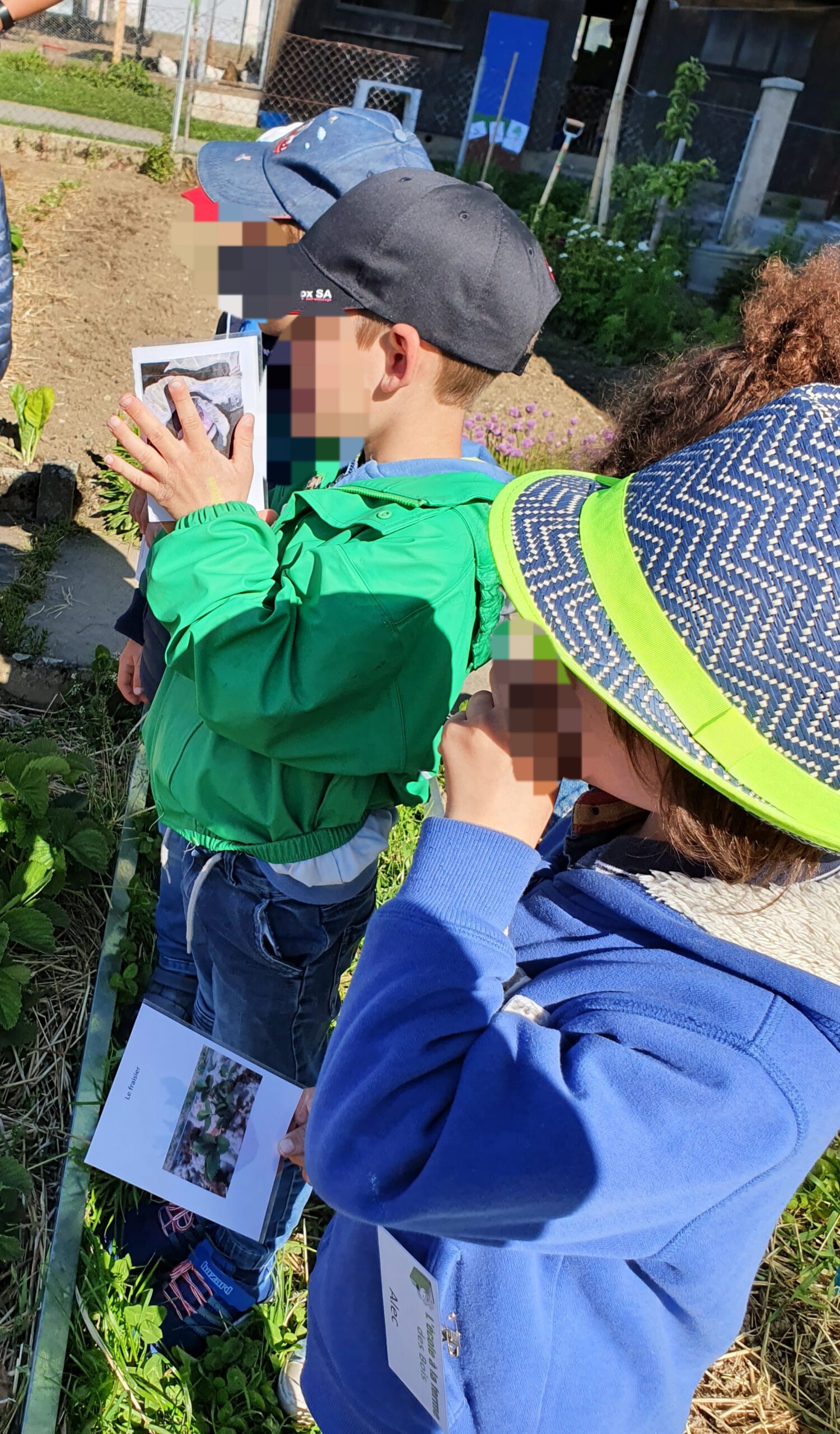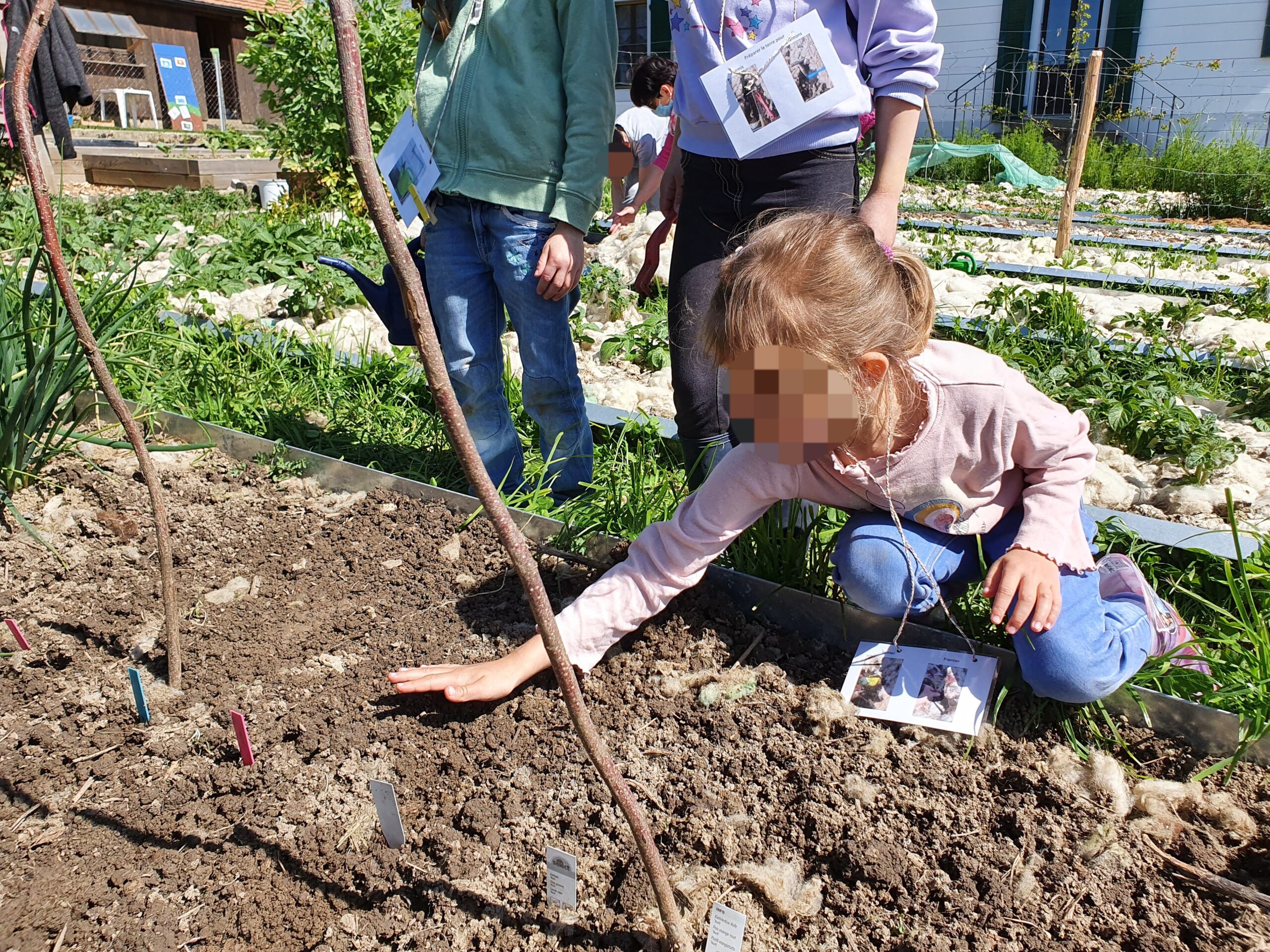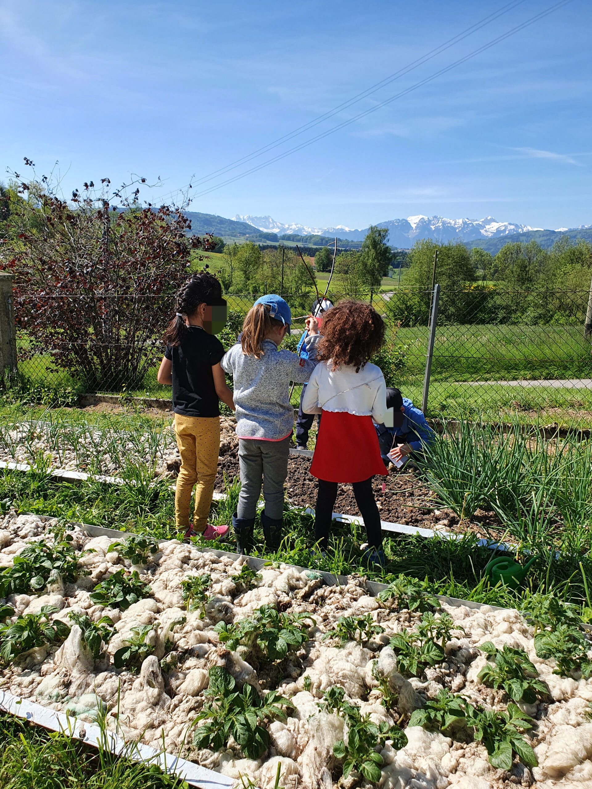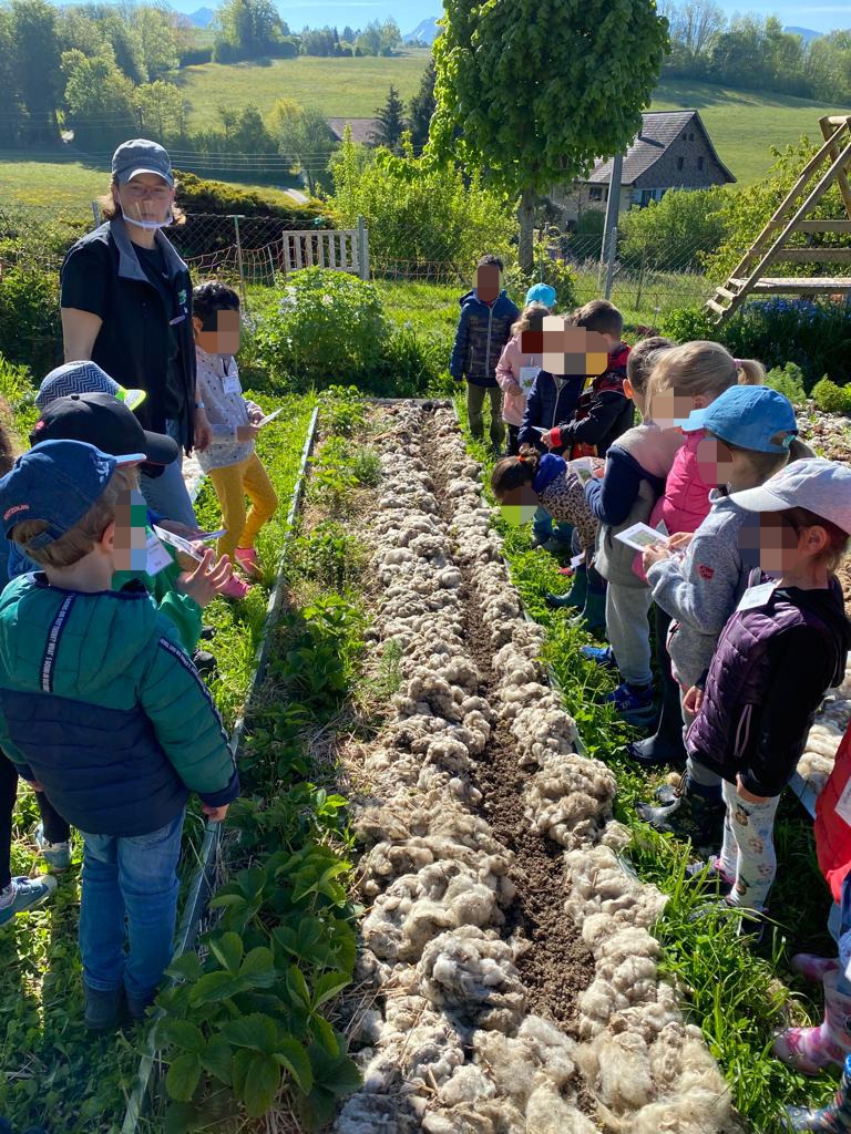 Ce vendredi matin, les élèves 1-2P de Annik Colomb sont venus découvrir le potager.