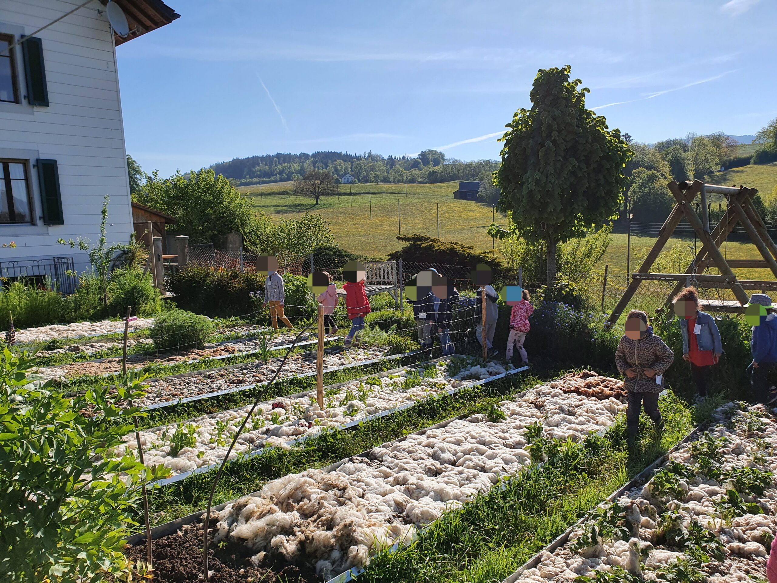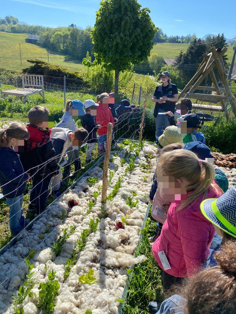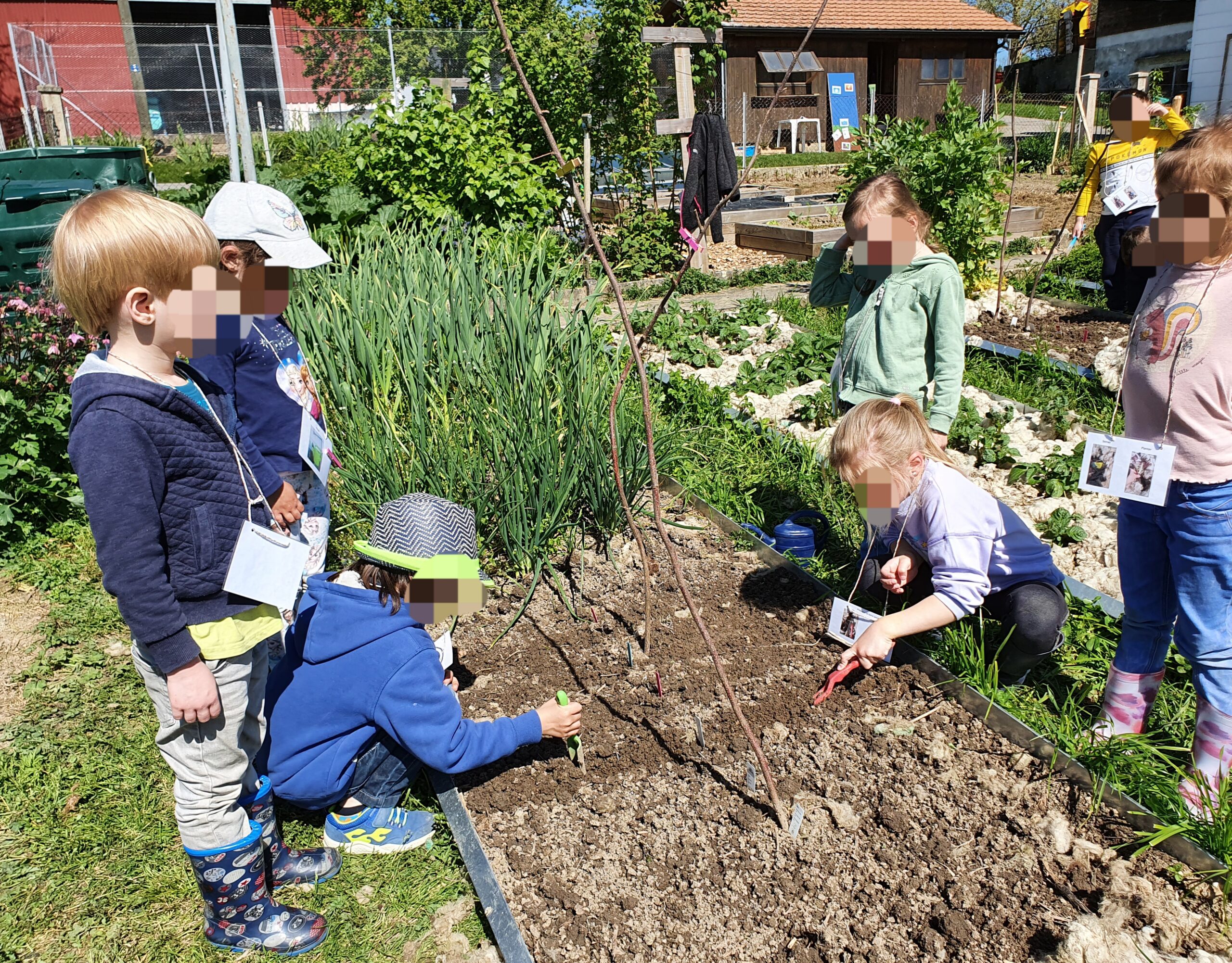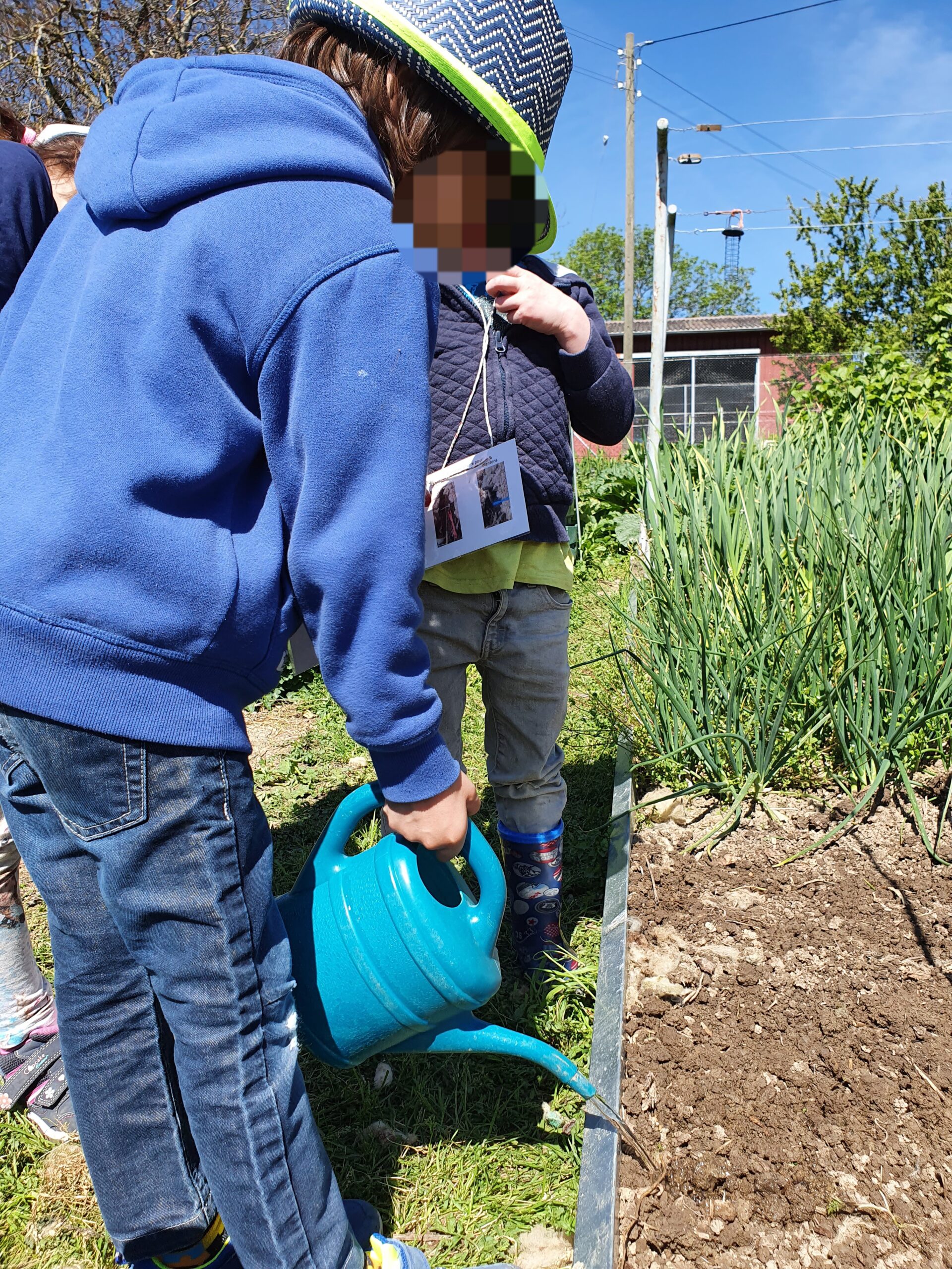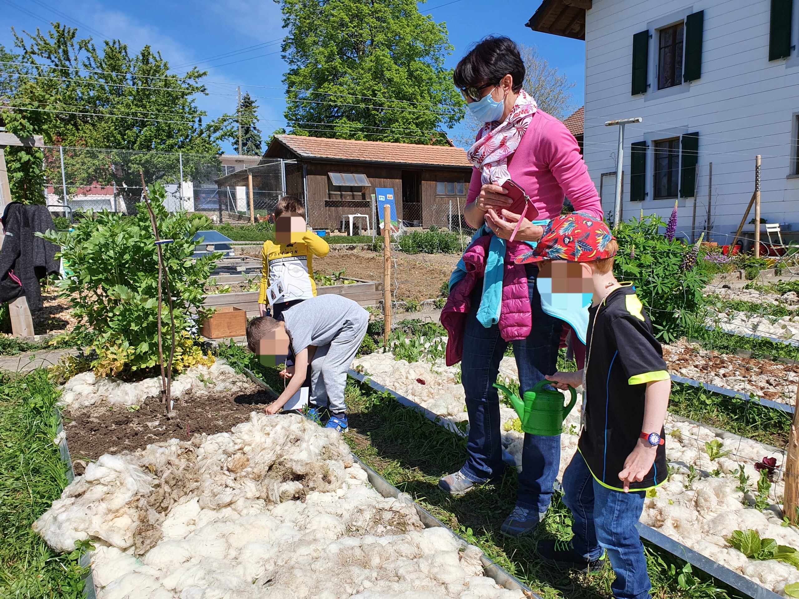 Ce vendredi matin, les élèves 1-2P de Annik Colomb sont venus découvrir le potager.