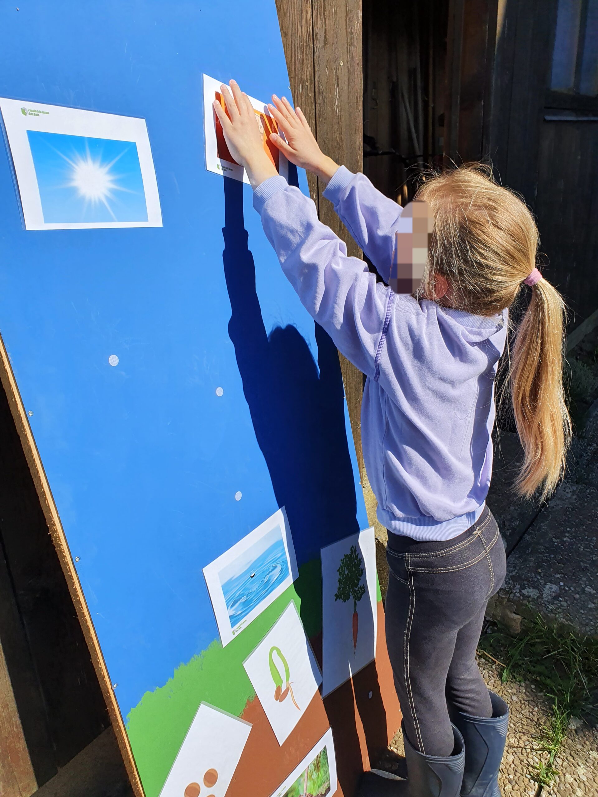 Ensuite, nous parlons des besoins des légumes pour pousser: de l’eau, des nutriments dans la terre (compost), du soleil 🌞 et de la chaleur. Nous en profitons pour parler brièvement de la photosynthèse. A chaque fois, les élèves affichent les images correspondantes à leur réponse.