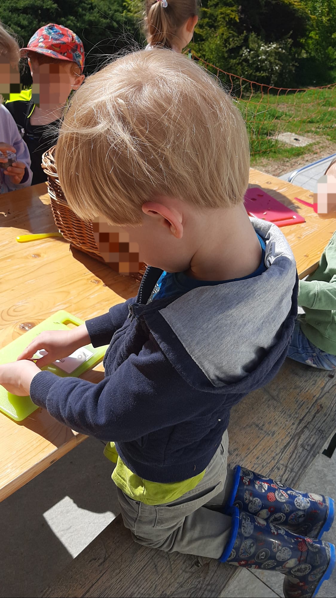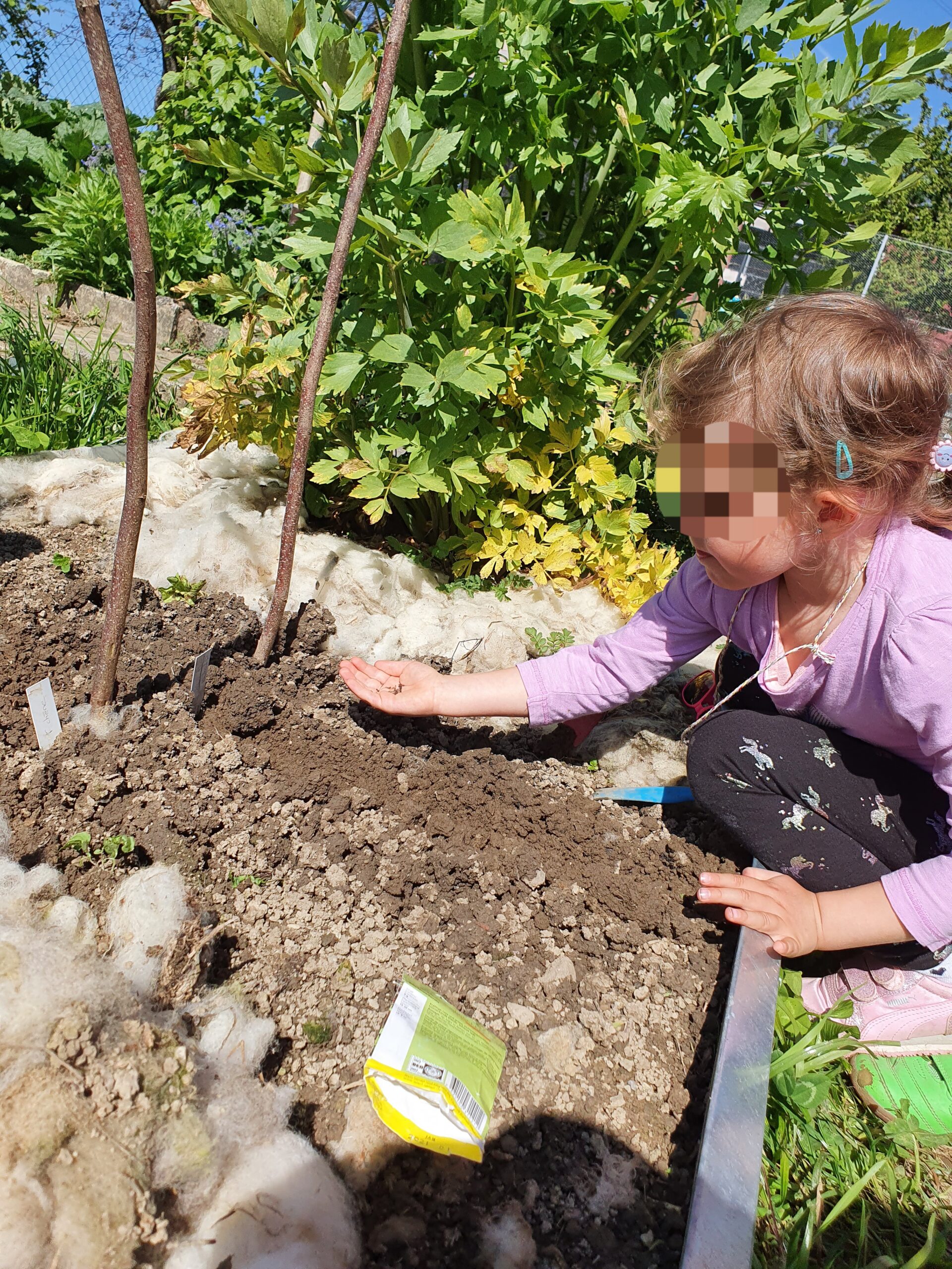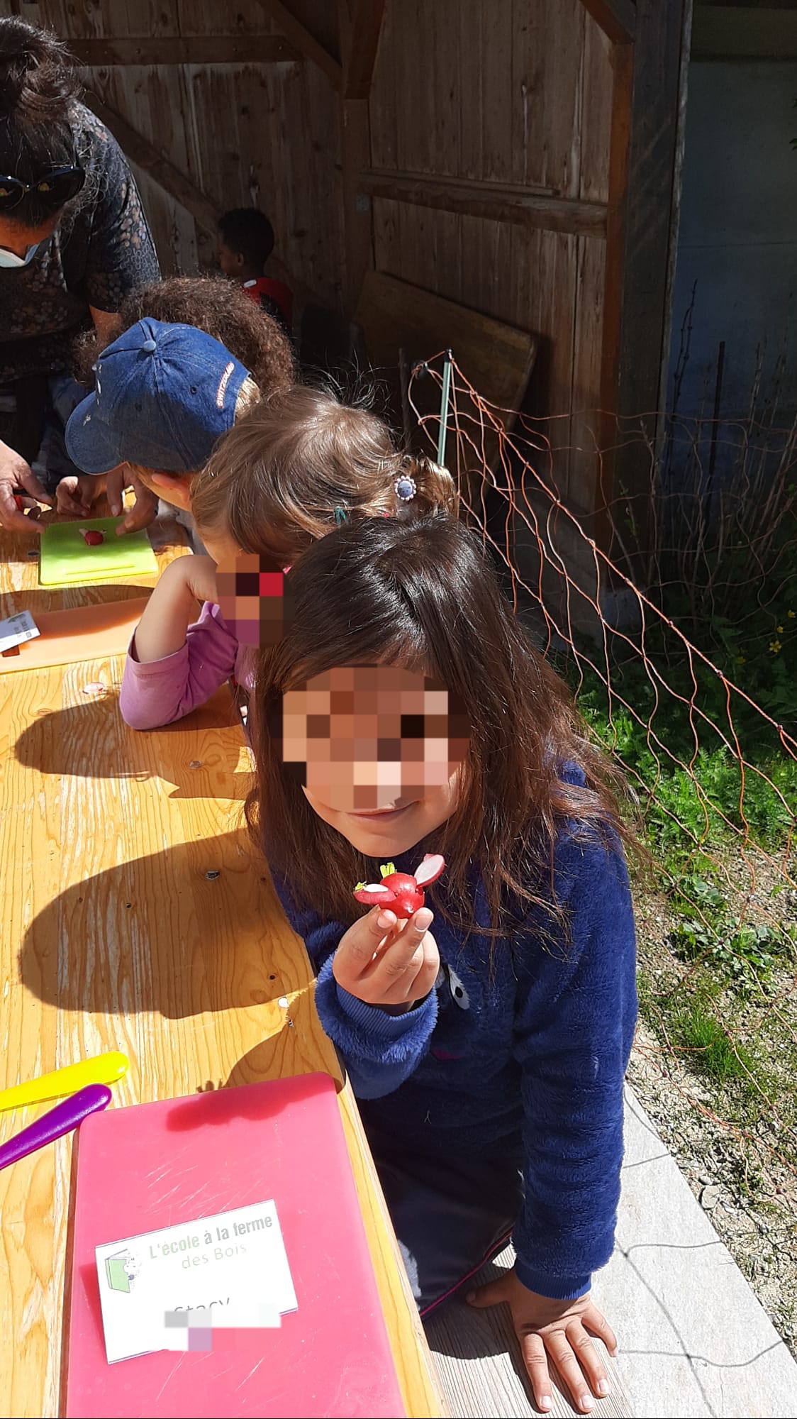 Je leur montre un grain de blé qui a germé au jardin. Puis les élèves observent le potager, ils comparent le mien à celui de grand-maman et s’y promènent pour le découvrir. Pour découvrir les différents légumes du potager, nous le faisons par un jeu. Je leur donne une image de légumes pour que les élèves puissent les rechercher. Ils ont trouvé les patates 🥔, les petits pois, les salades🥬 ou encore les choux, etc. Chaque groupe nous présente son légume. Et nous parlons des différentes manières de les cuisiner. 🥘