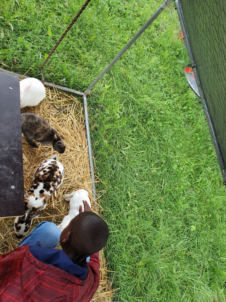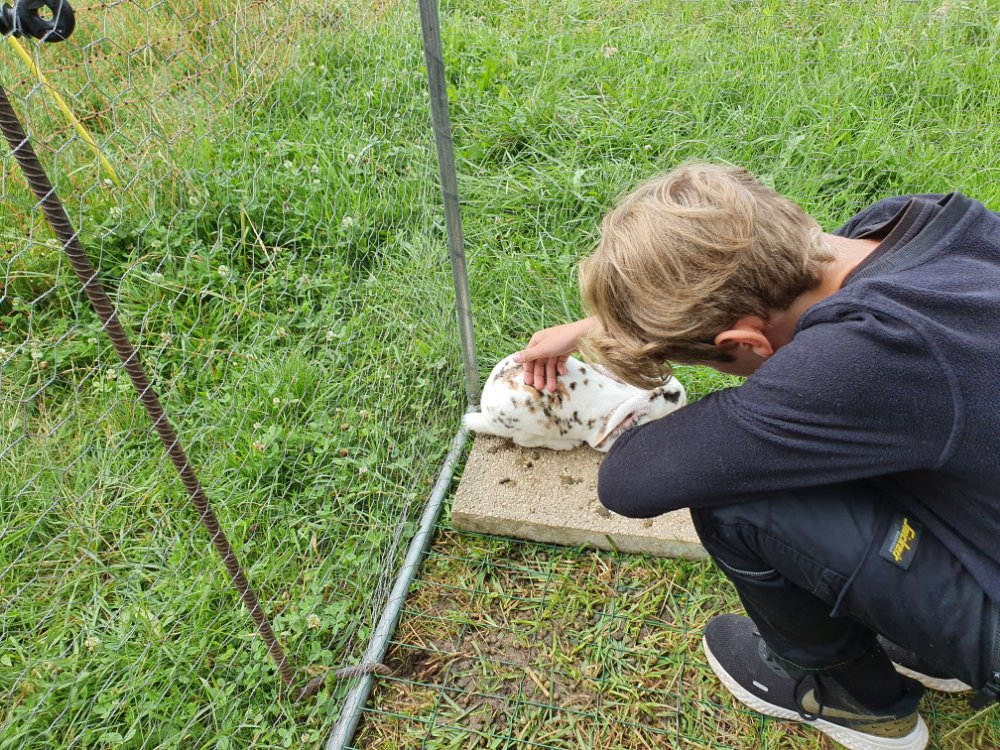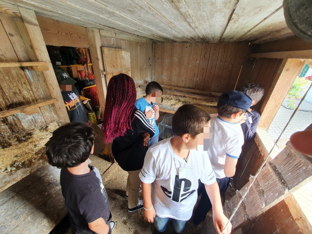 Nous découvrons les lapins 🐰 , les poules et leur habitat pendant que l’autre groupe découvre la table du toucher 🖐🏻 et le sentier pieds 👣 nus. De belles sensations! 🤩