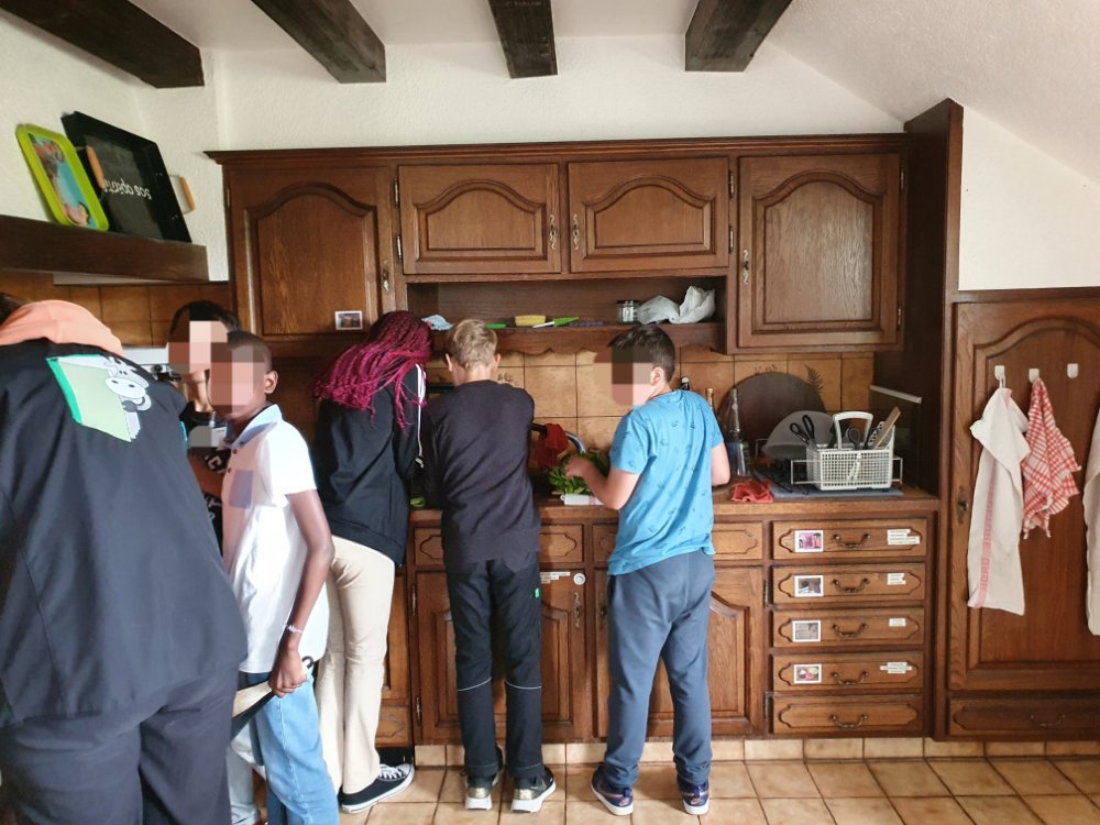 Avant de passer en cuisine, nous allons au potager chercher de la ciboulette et du persil 🌱 puis au poulailler chercher des œufs. 🥚