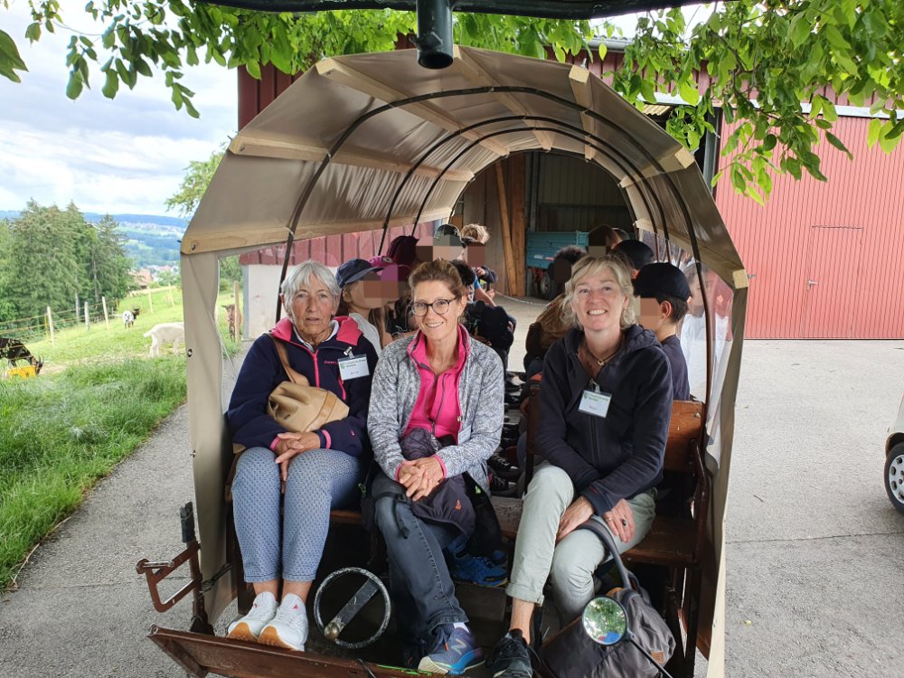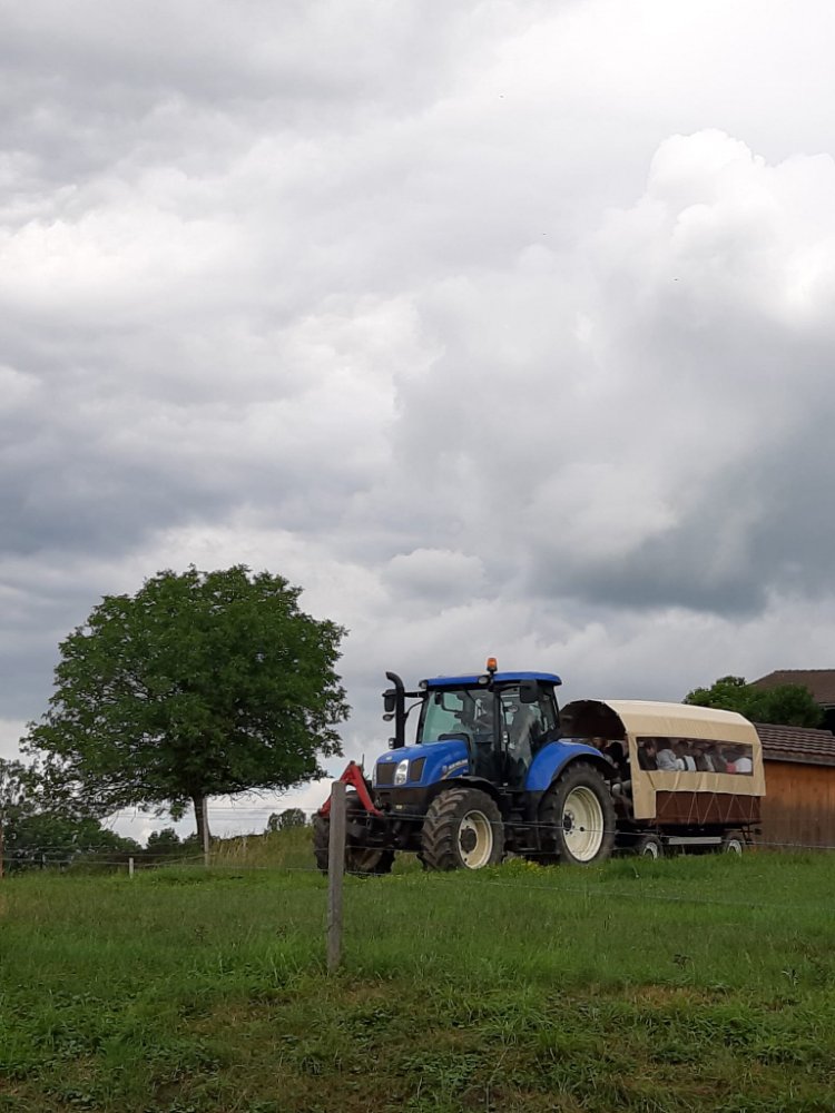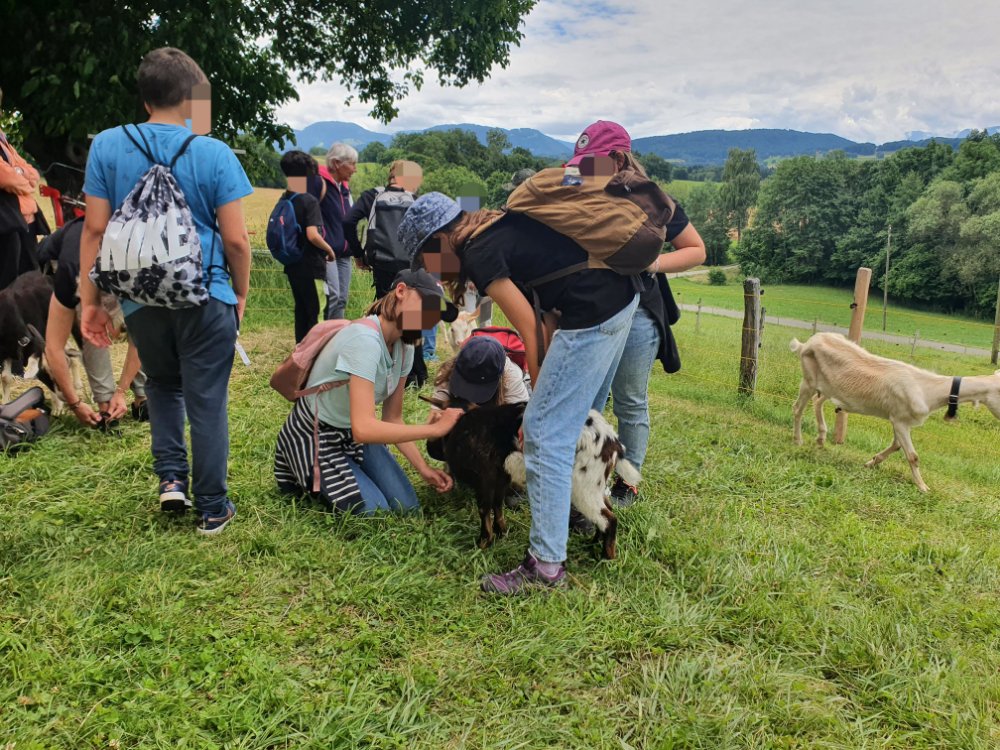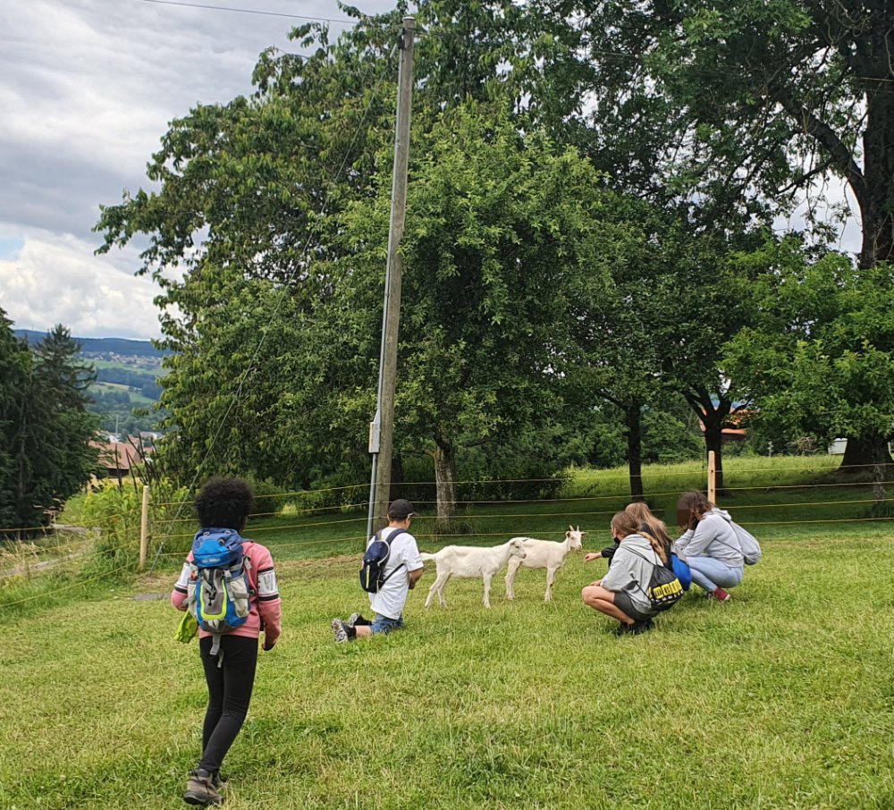 Une fois le repas terminé et la vaisselle rangée, nous passons faire un câlin aux chèvres 🐐, puis nous partons joyeusement à la ferme de Fochaux. 🚜
