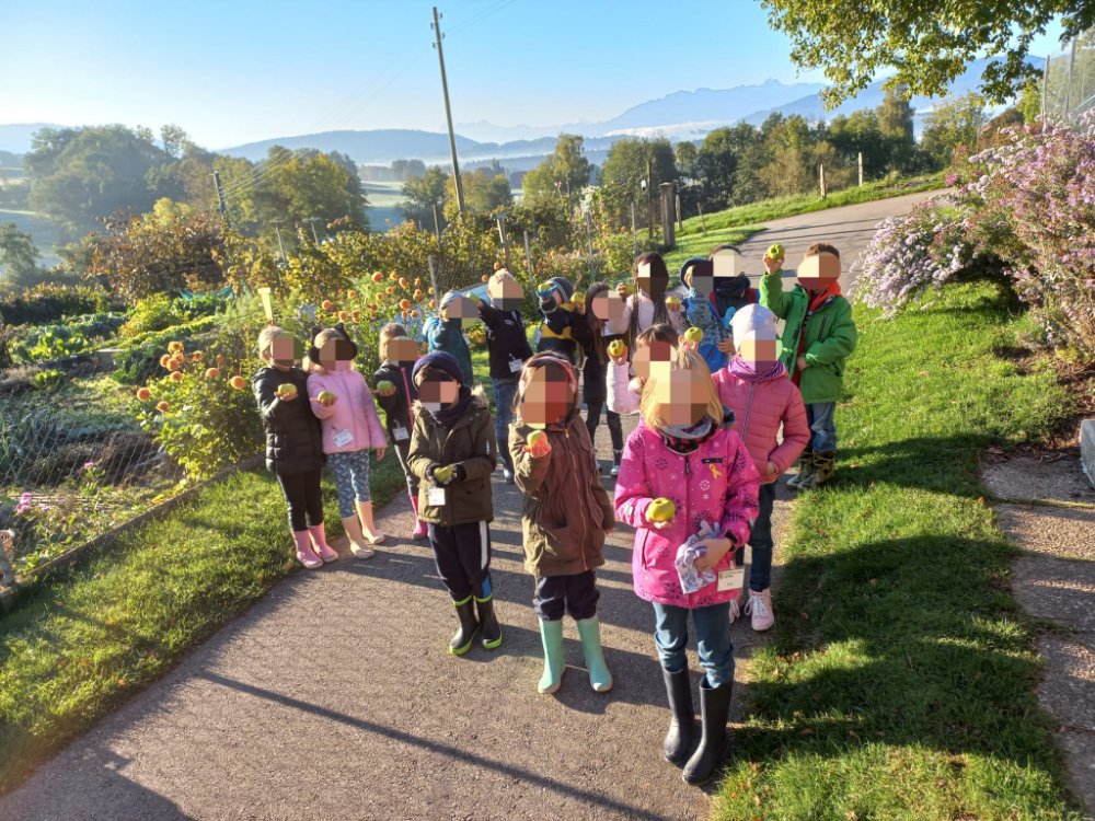 Ce jeudi, les élèves 3P de Jessica Géraud et Lydia Favre d’Essertes sont venus découvrir le verger en automne.