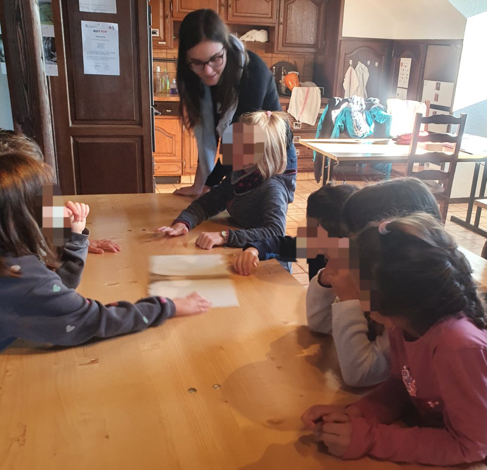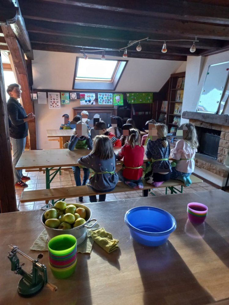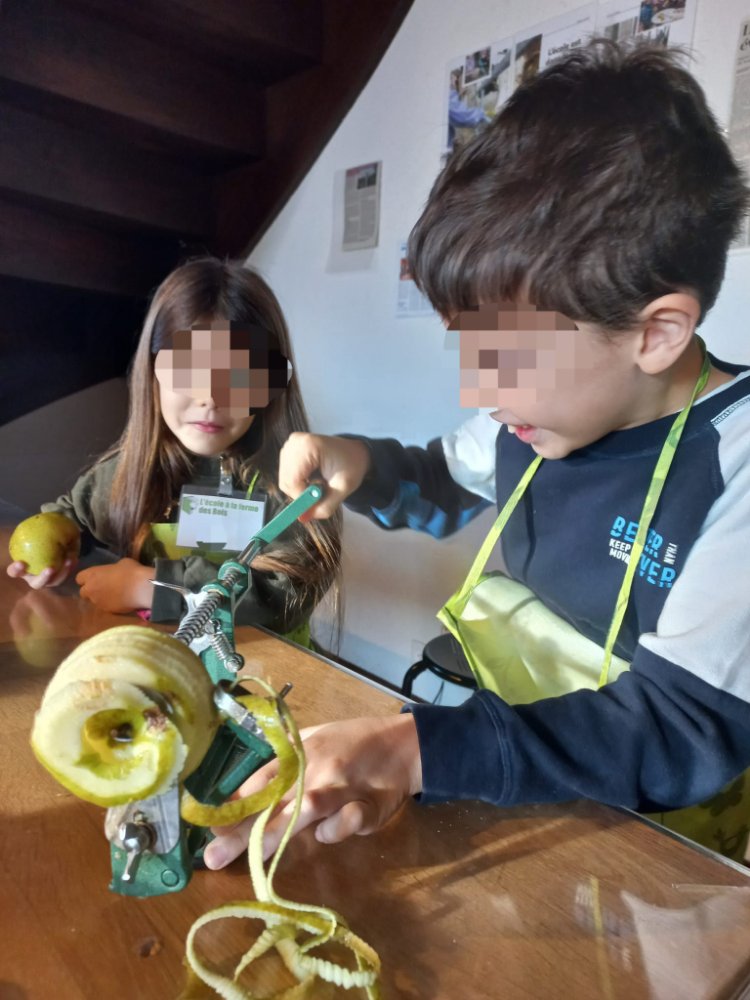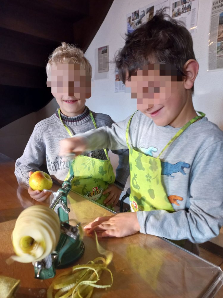 Nous parlons de l’origine du mot pomme 🍎 , pommum en latin et sa signification. Puis je leur explique que le gel de ce printemps a empêché la floraison ou la pollinisation et de ce fait la récolte est nulle. Mais que nous allions chercher à la cave celles que j’ai acheté. 😊