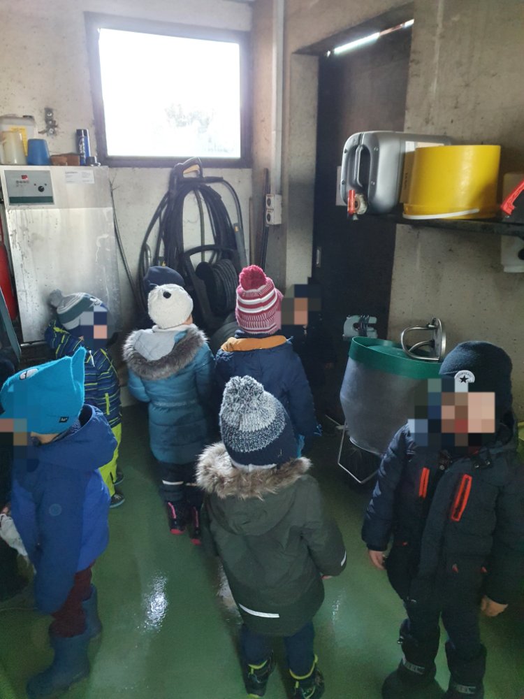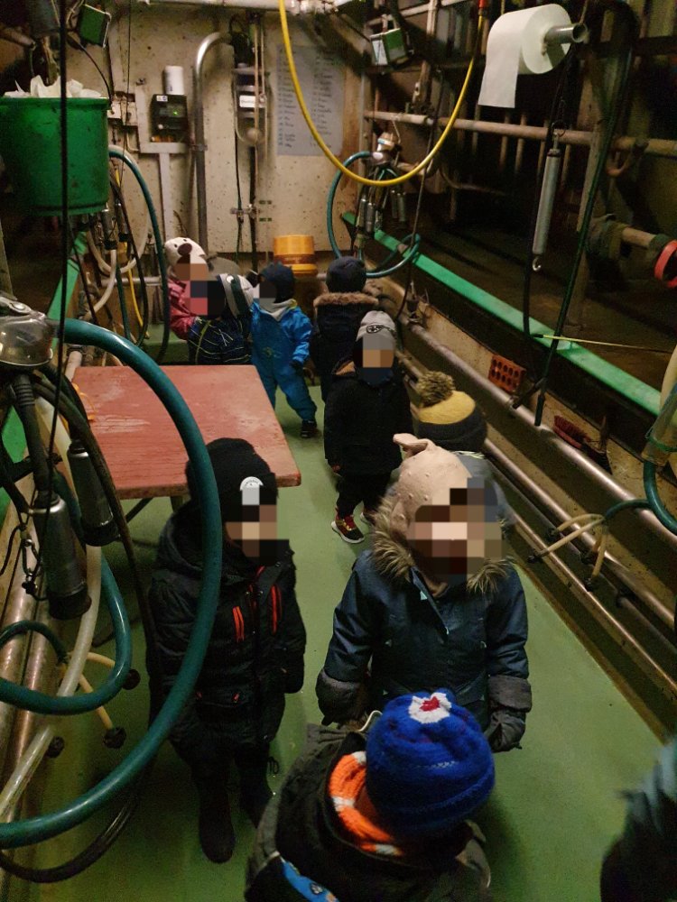Ensuite nous sommes allés visiter la salle de traite pour que les enfants découvrent l’endroit ou nous trayons les vaches et je leur explique que cela se déroule 2x par jour et ce tout les jours de la semaine.