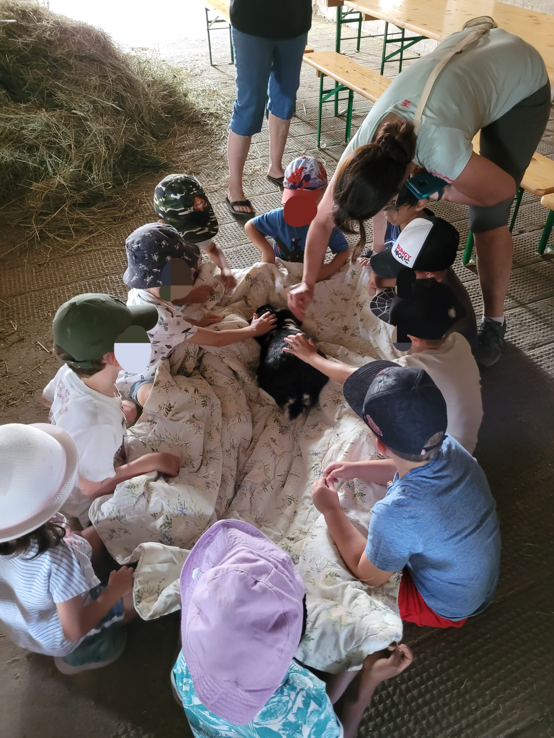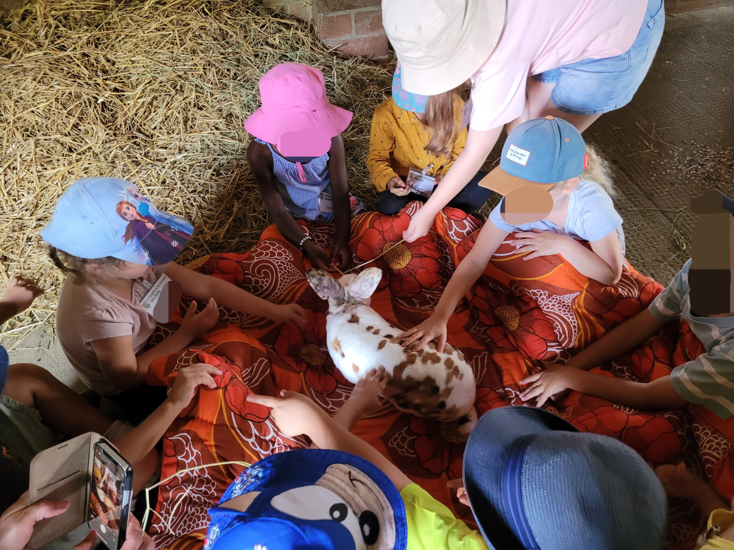 La récré étant terminée, nous partons pour la deuxième partie de la matinée. Nous allons tous découvrir des lapins 🐰. Les enfants s’installent en 3 cercles à la grange, les jambes sous une couverture. Nous y déposons un lapin pour chaque groupe. Pendant que les enfants leur font des câlins, je passe vers chaque groupe pour leur expliquer ce que fait la lapine quand elle va faire ses lapereaux. Ainsi que quelques particularités sur le lapins.
