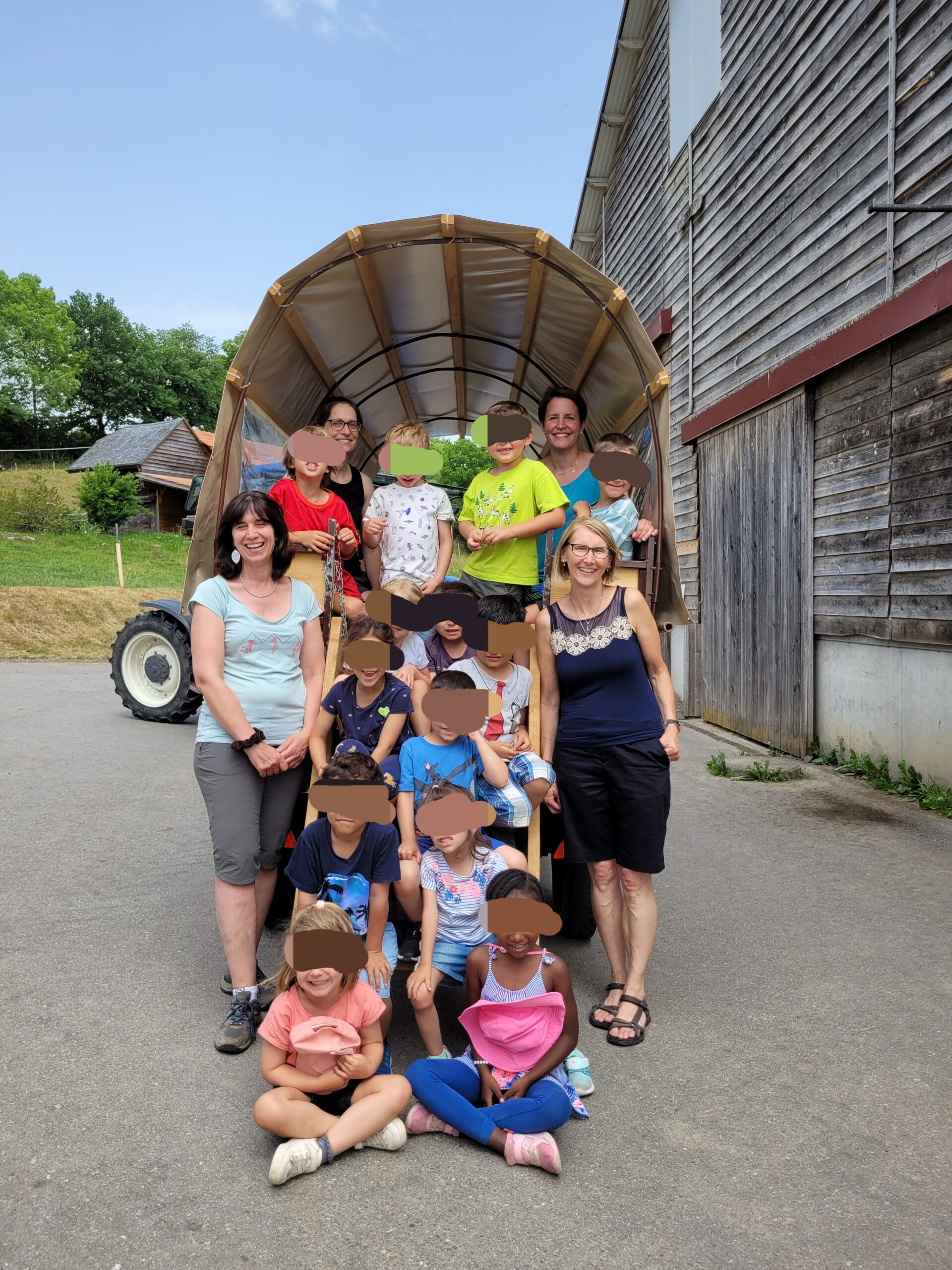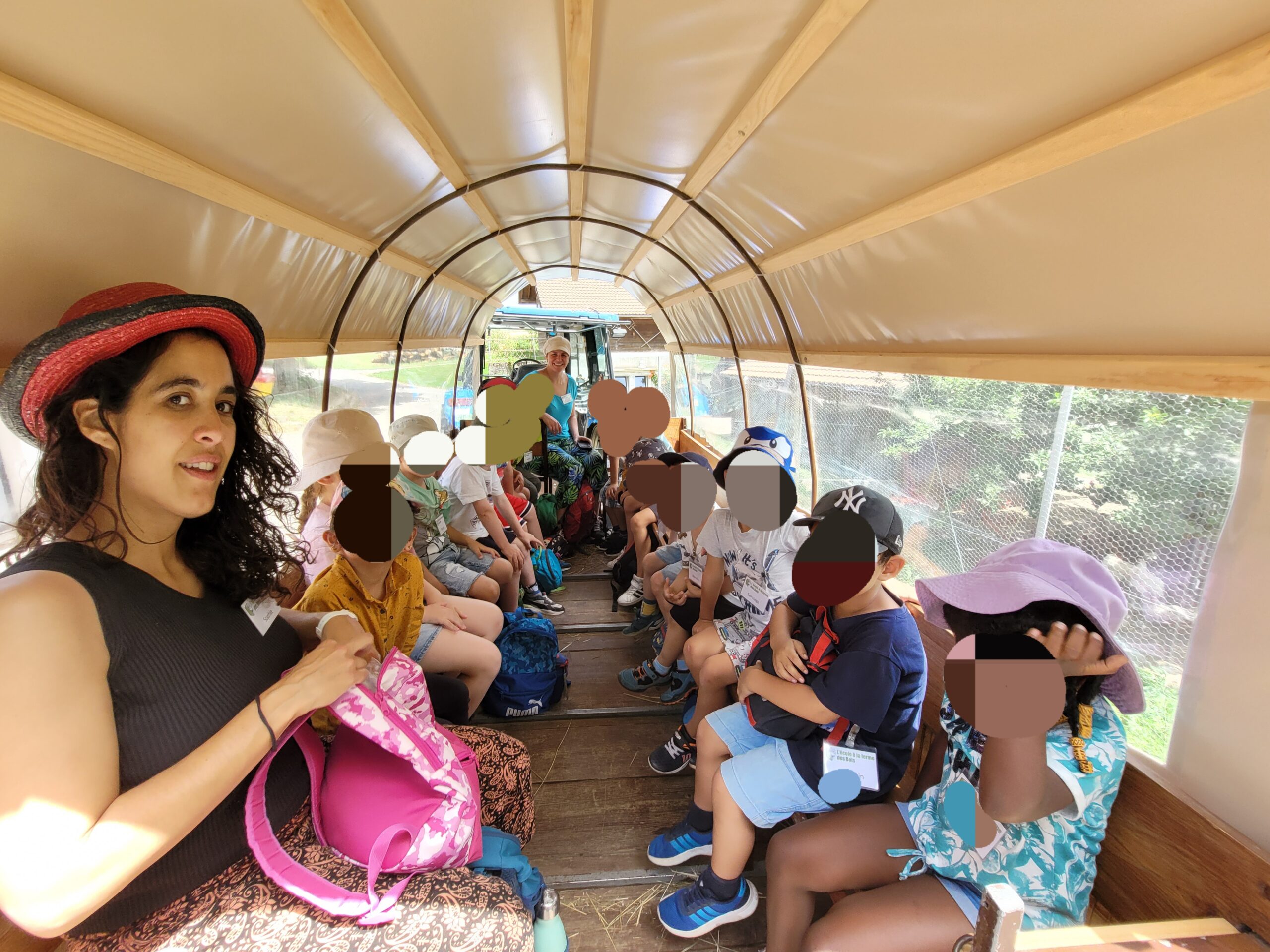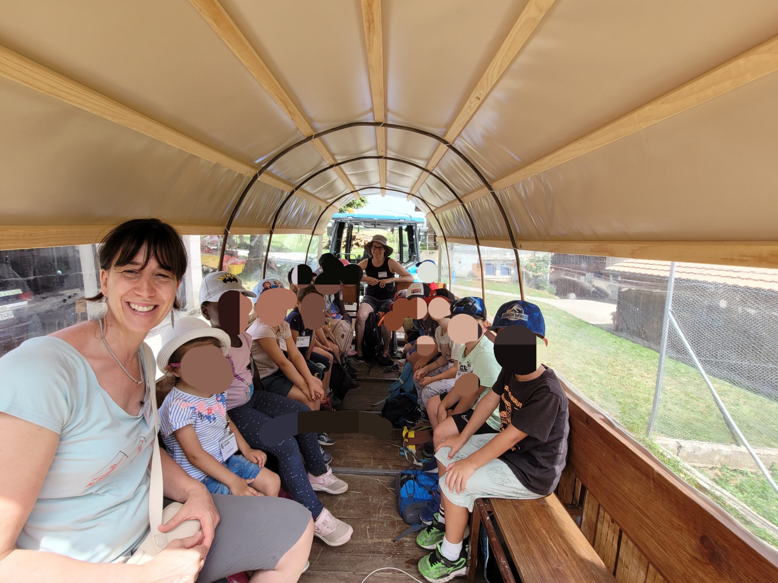 Après le pique-nique, nous partons gaiment en chariote à la ferme pour découvrir l’étable. 🥳