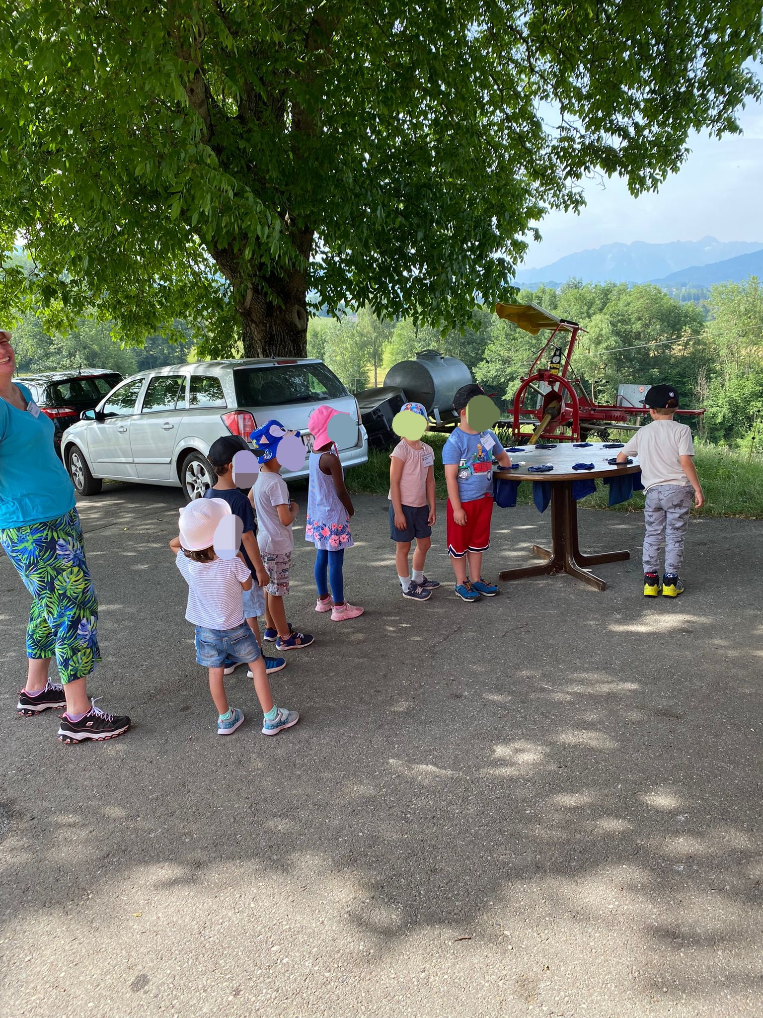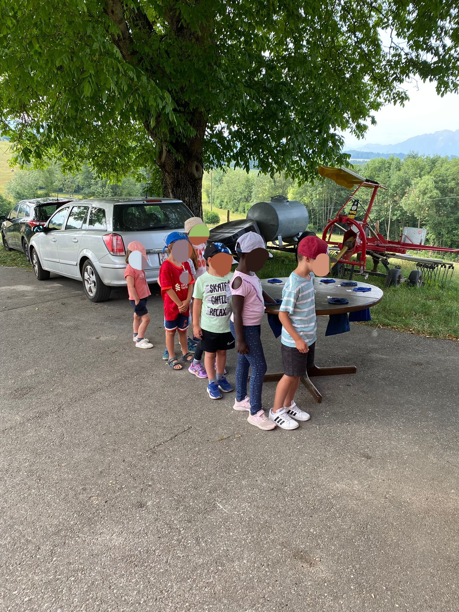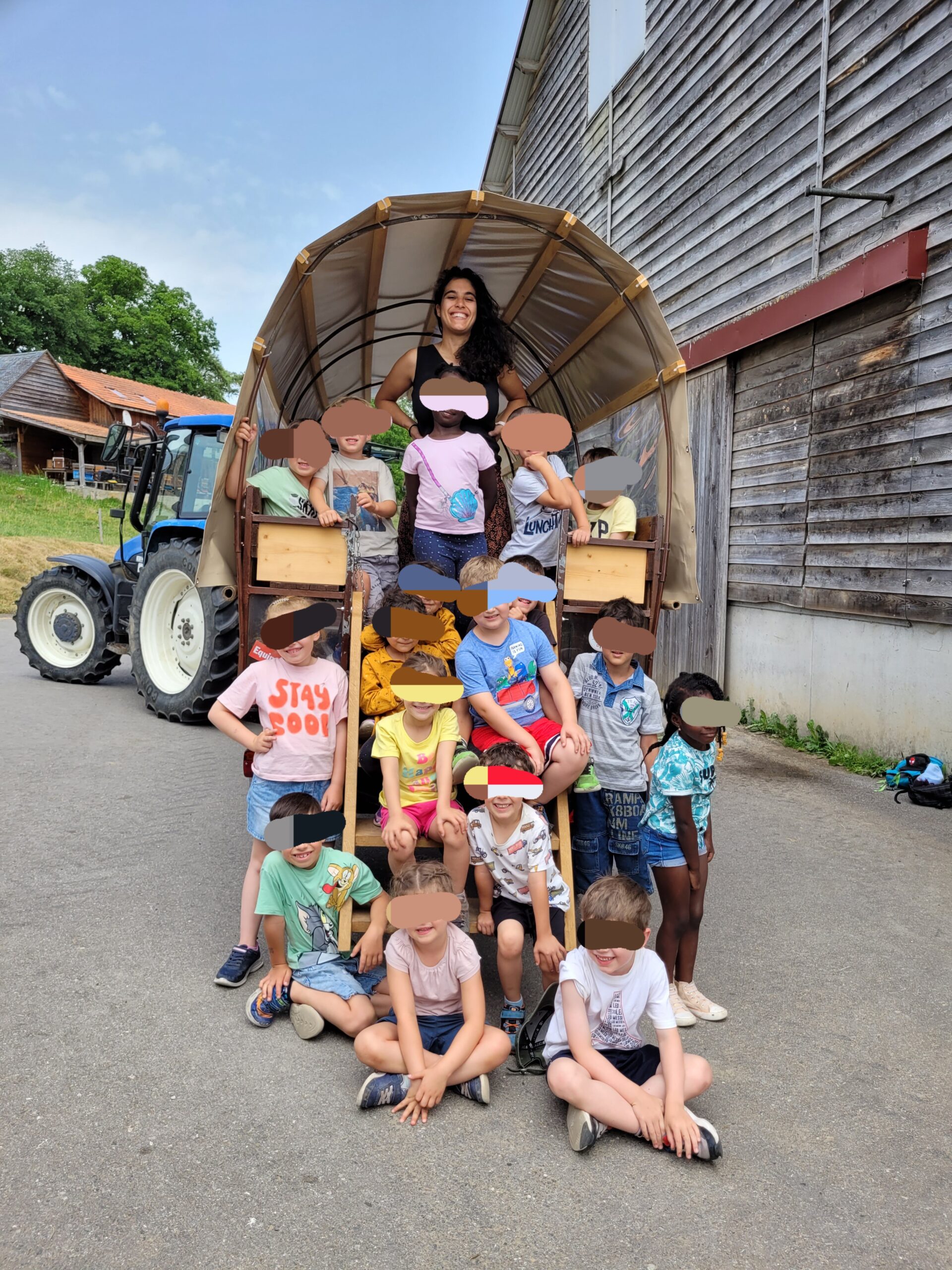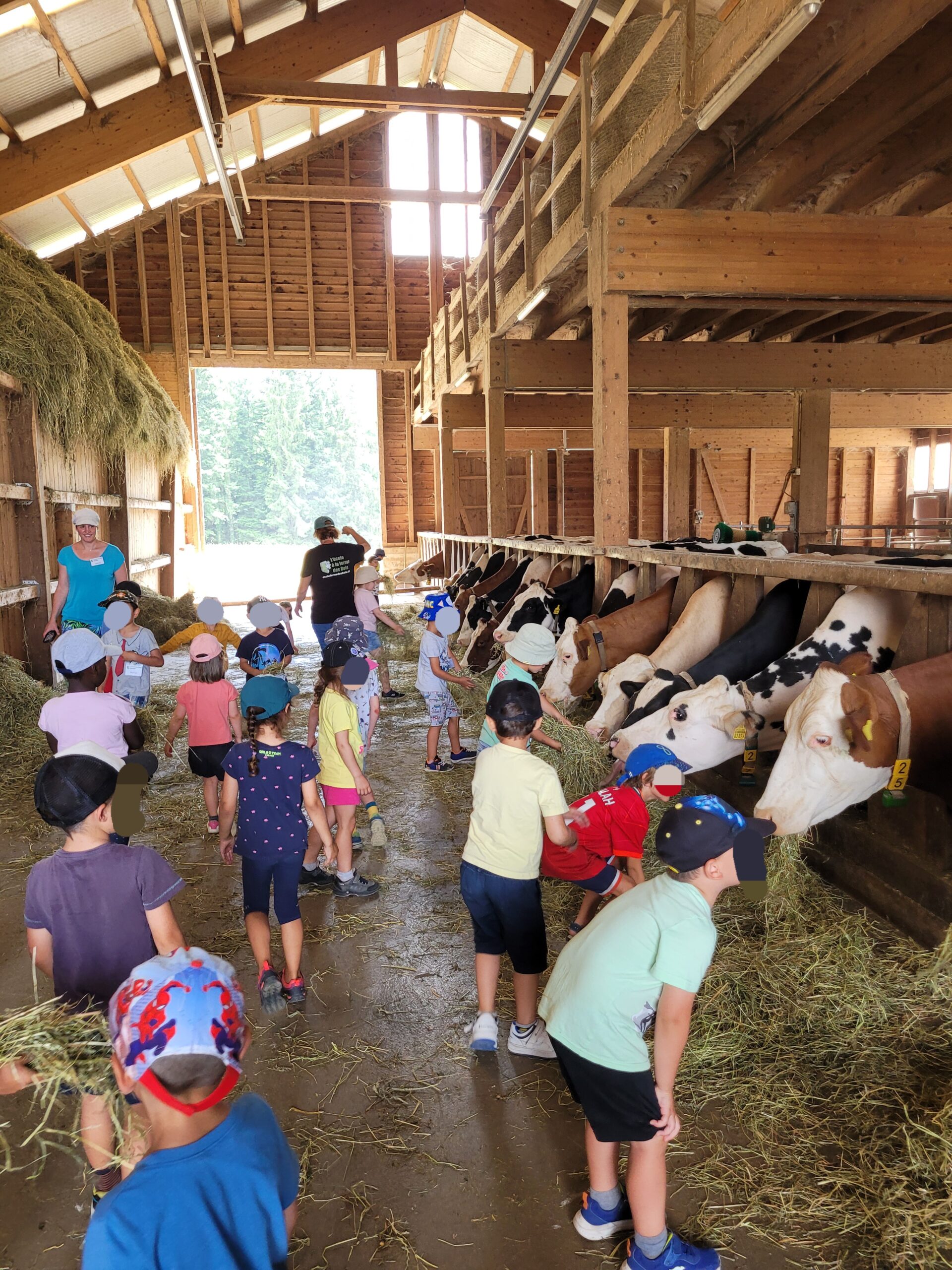 Après le pique-nique, nous partons gaiment en chariote à la ferme pour découvrir l’étable. 🥳