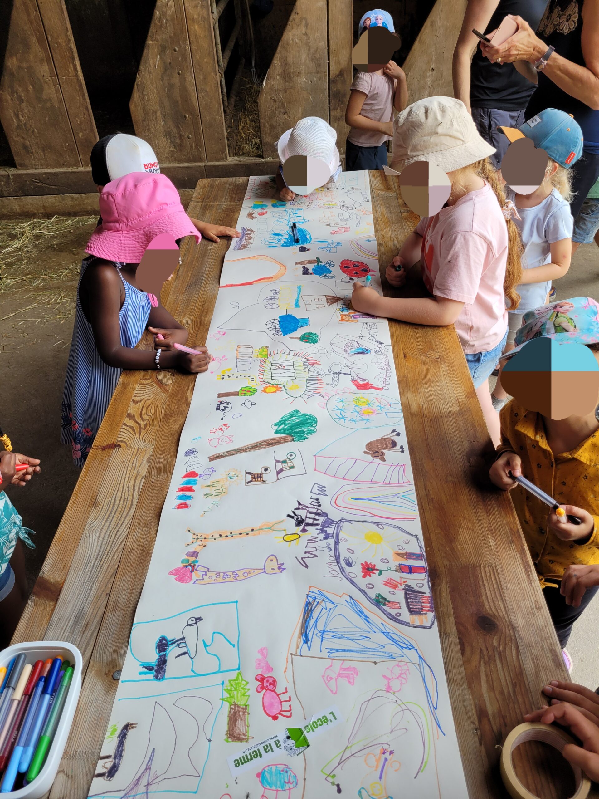 Pendant ce temps, l’autre groupe dessinait leur meilleur moment de la journée sur une fresque qu’ils ont pu emporter avec eux à l’école. Puis nous avons échangé les groupes.