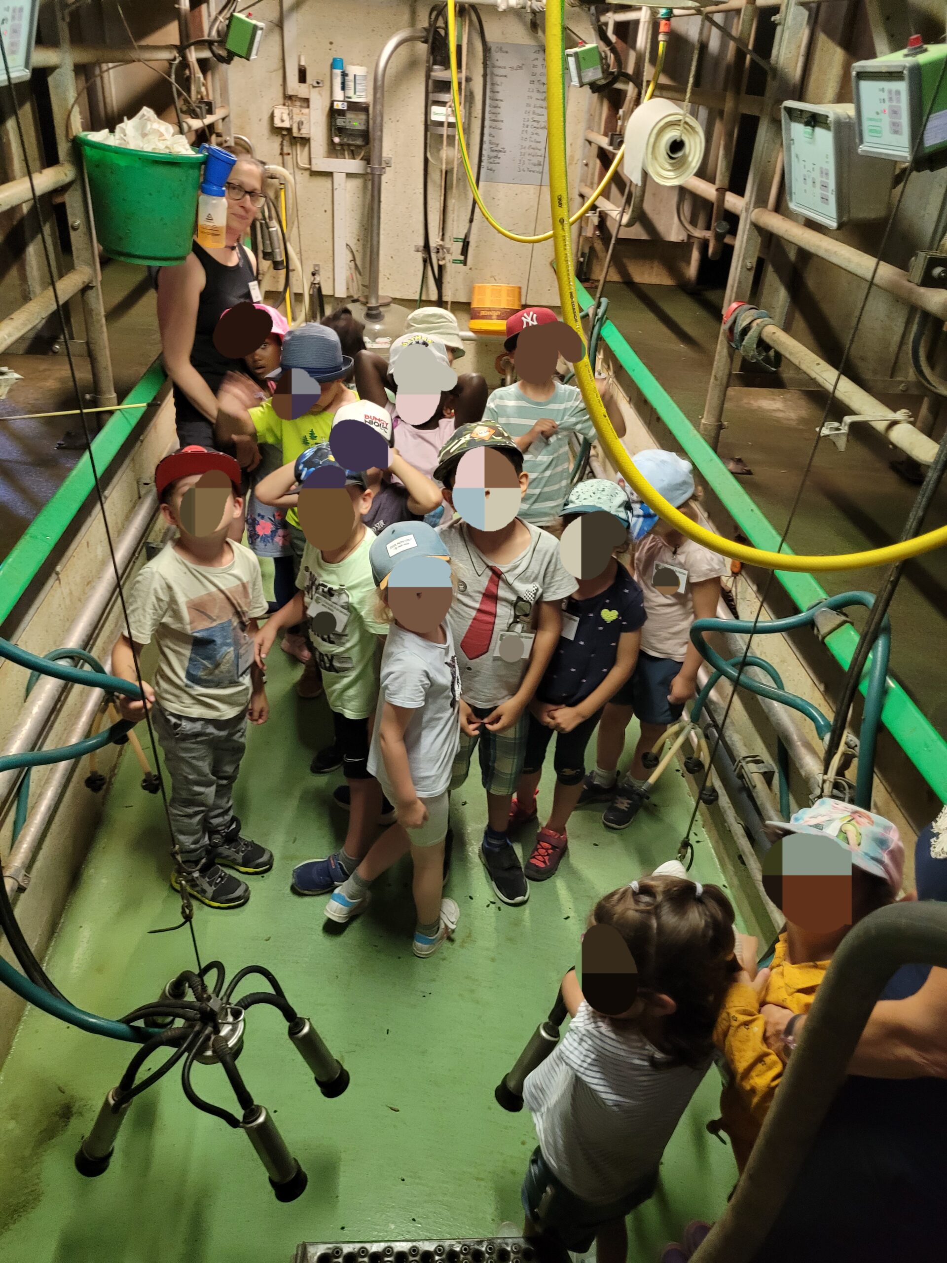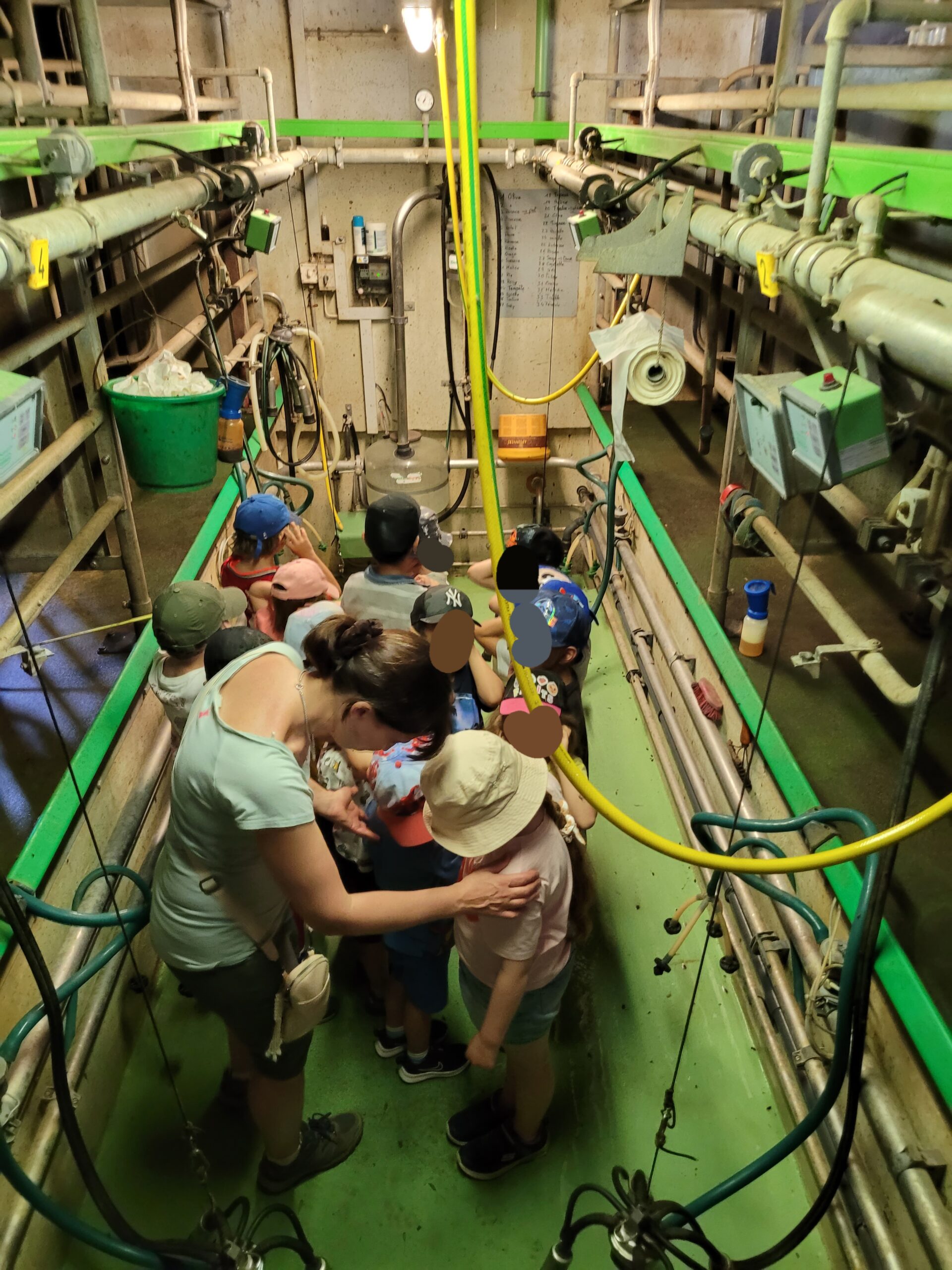 Puis, nous faisons les mêmes groupes que pour le matin. Un groupe vient avec moi pour visiter la salle de traite. Je leur montre comment fonctionne la machine à traire. Je leur explique quand est-ce que l’on trait les vaches ou encore combien de lait produit, en moyenne par année, une vache. Ensuite nous passons par la chambre à lait pour finir auprès des veaux.