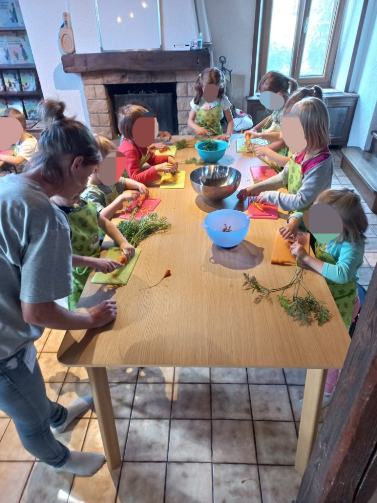 Mains lavées, manches retroussées, c’est parti pour cuisiner 💪🏻! Nous épluchons les carottes et les patates que nous coupons en morceaux. Nous coupons le poireau en rondelles puis je leur montre comment faire avec le céleri pour qu’ils puissent tous observer.