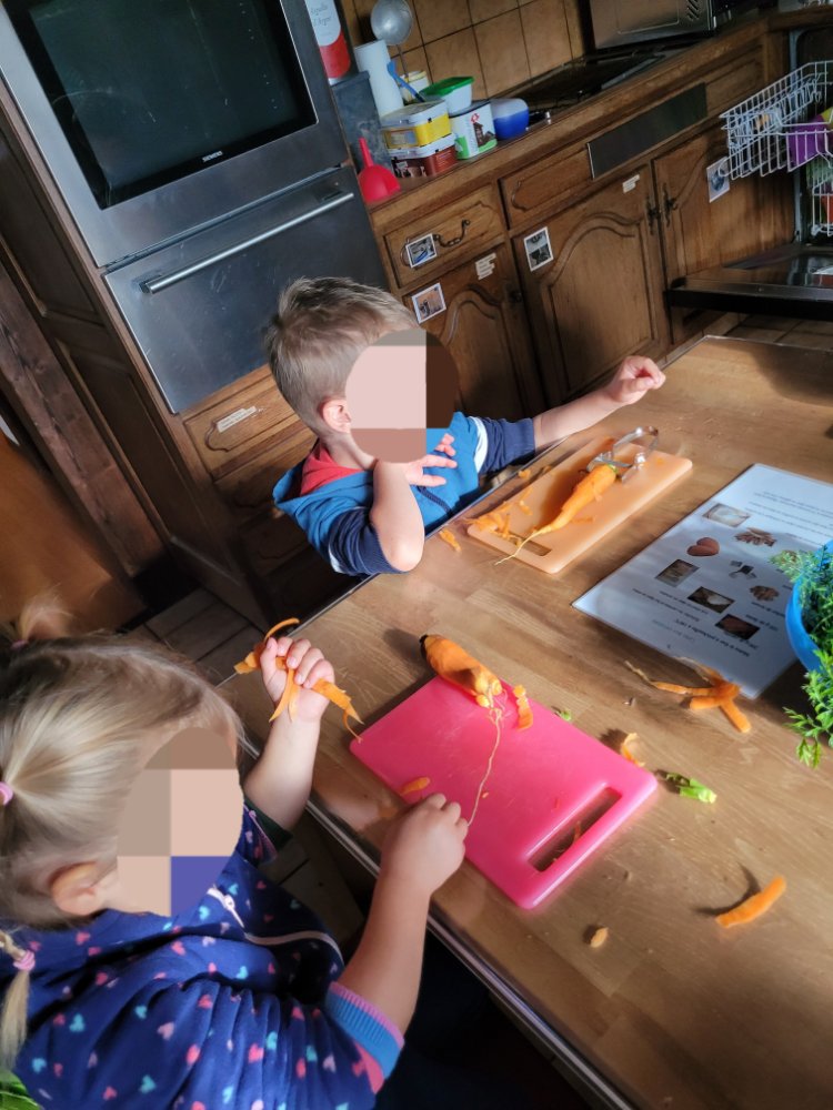 En salle, nous aidons les enfants à éplucher leur carotte. Puis chacun leur tour, les enfants vont pouvoir la râper.