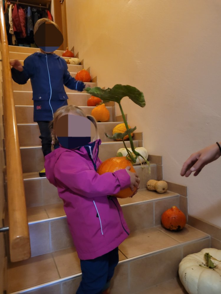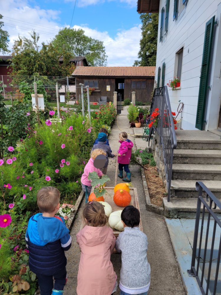 La récré terminée et les enfants défoulés, nous allons récolter les courges. Quel travail d’équipe! C’est juste super de voir ces petits lutins s’entraider si facilement. Au top!