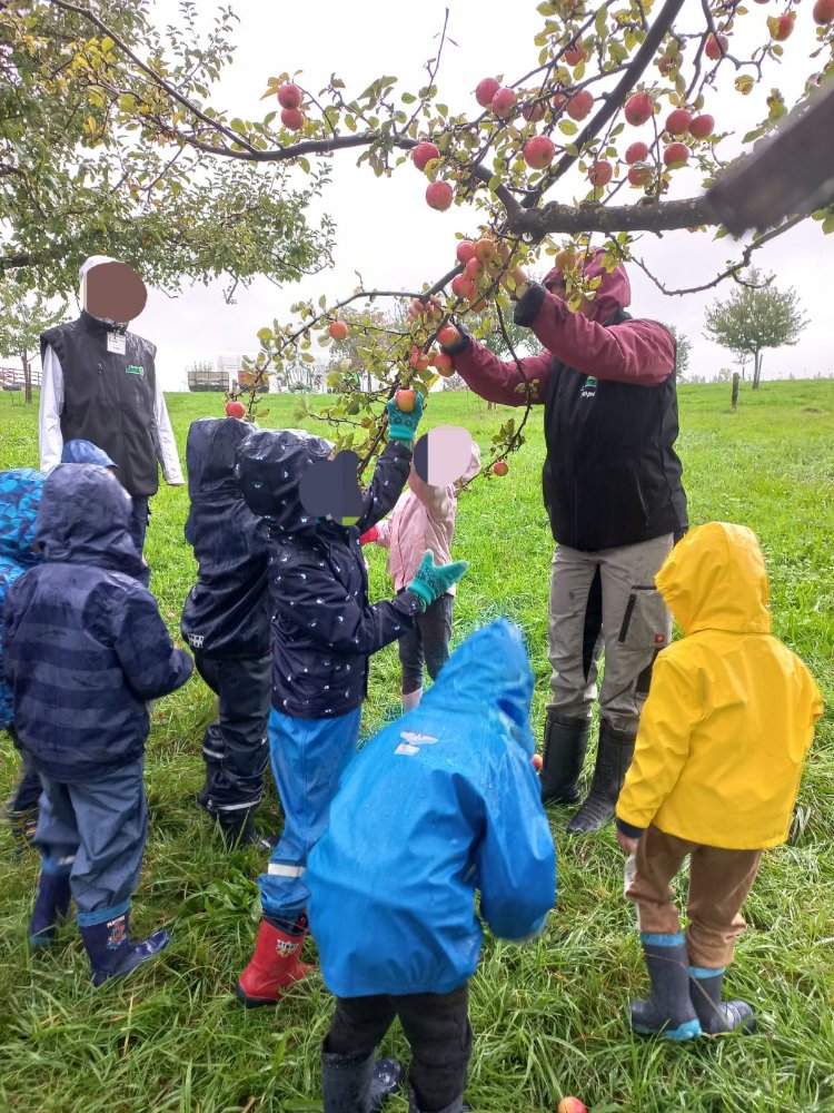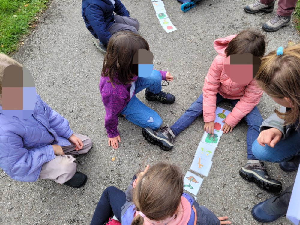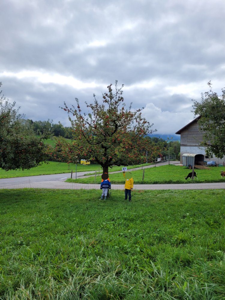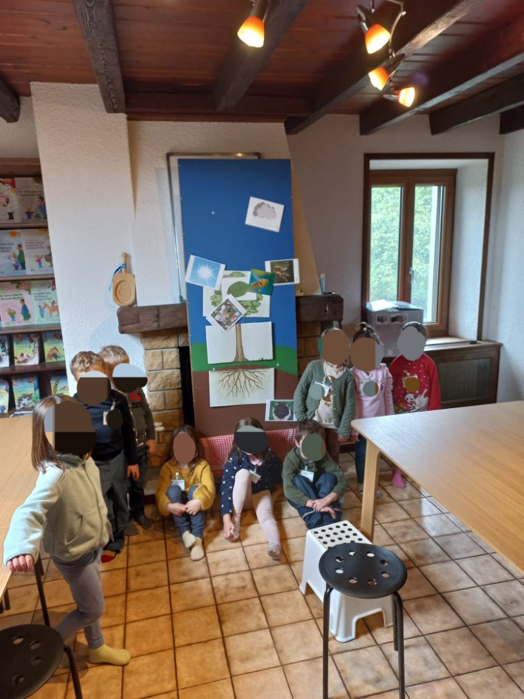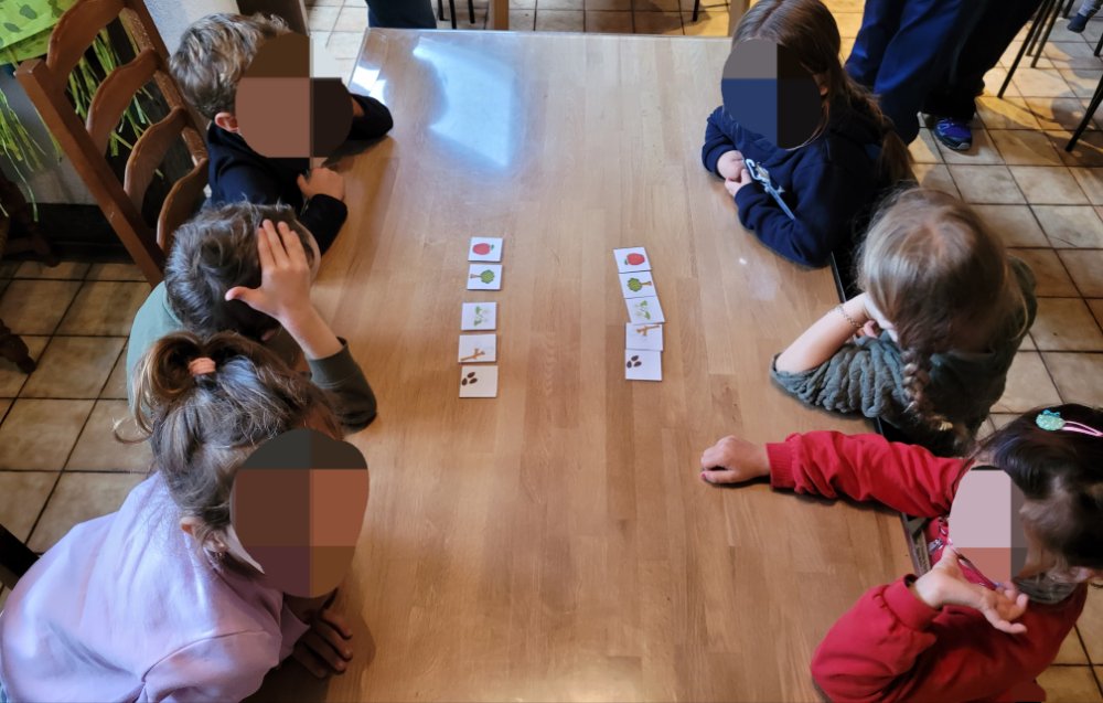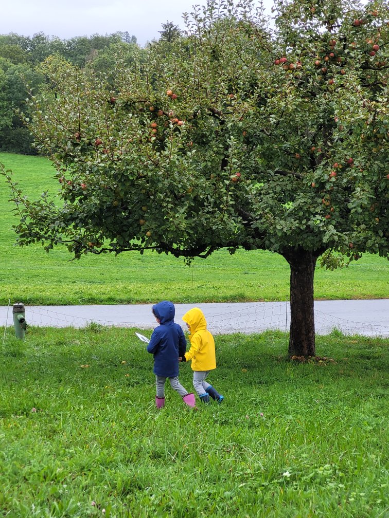 Ensuite nous faisons 2 groupes. Un groupe a parlé des arbres et de leurs besoins, en salle, par jeu imagé pendant que l’autre groupe a recherché les arbres fruitiers au verger, parfois sous la pluie ☔️, en découvrant ce qu’ils produisent et comment les manger 🥧. Puis nous avons échangé les groupes.