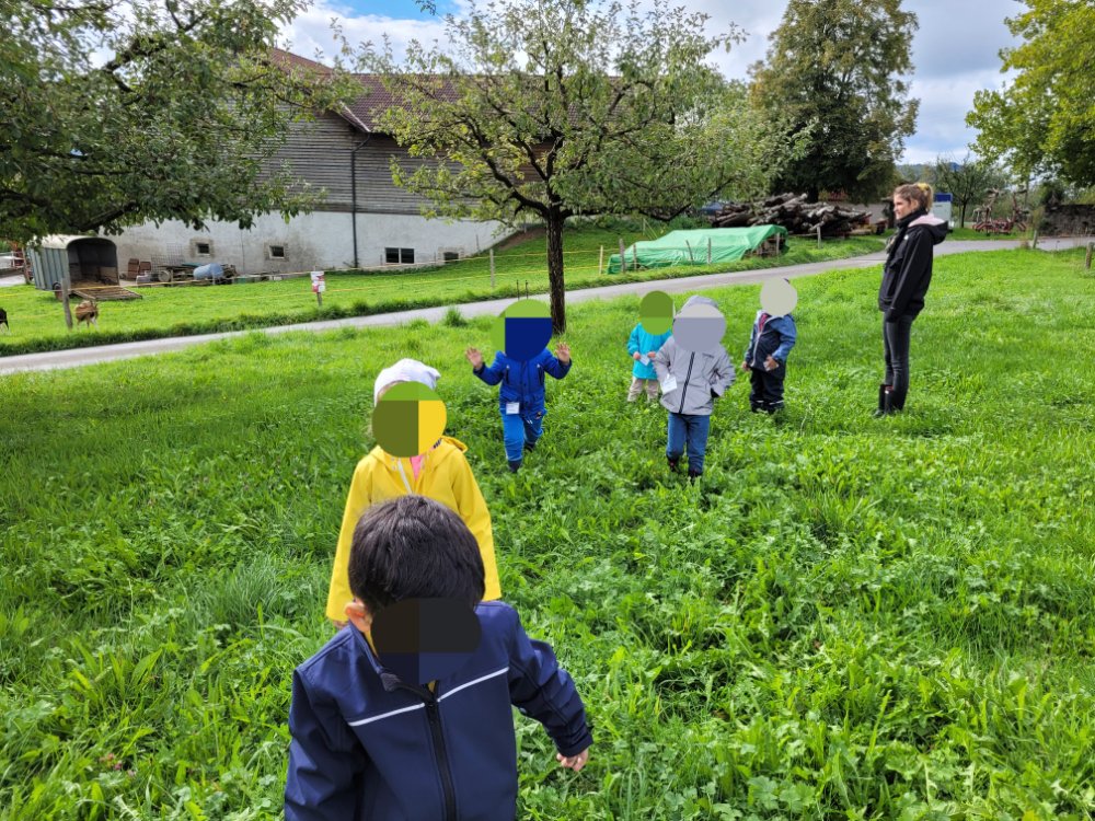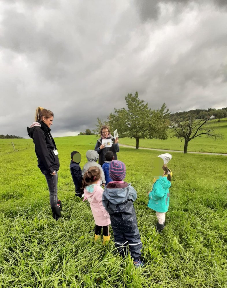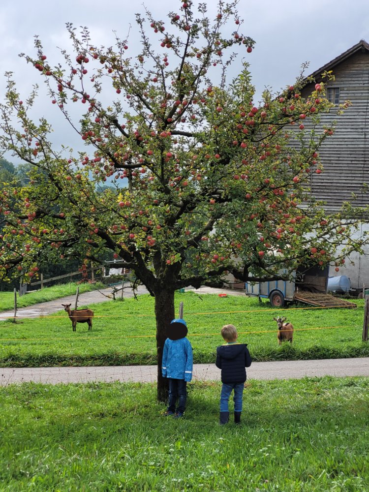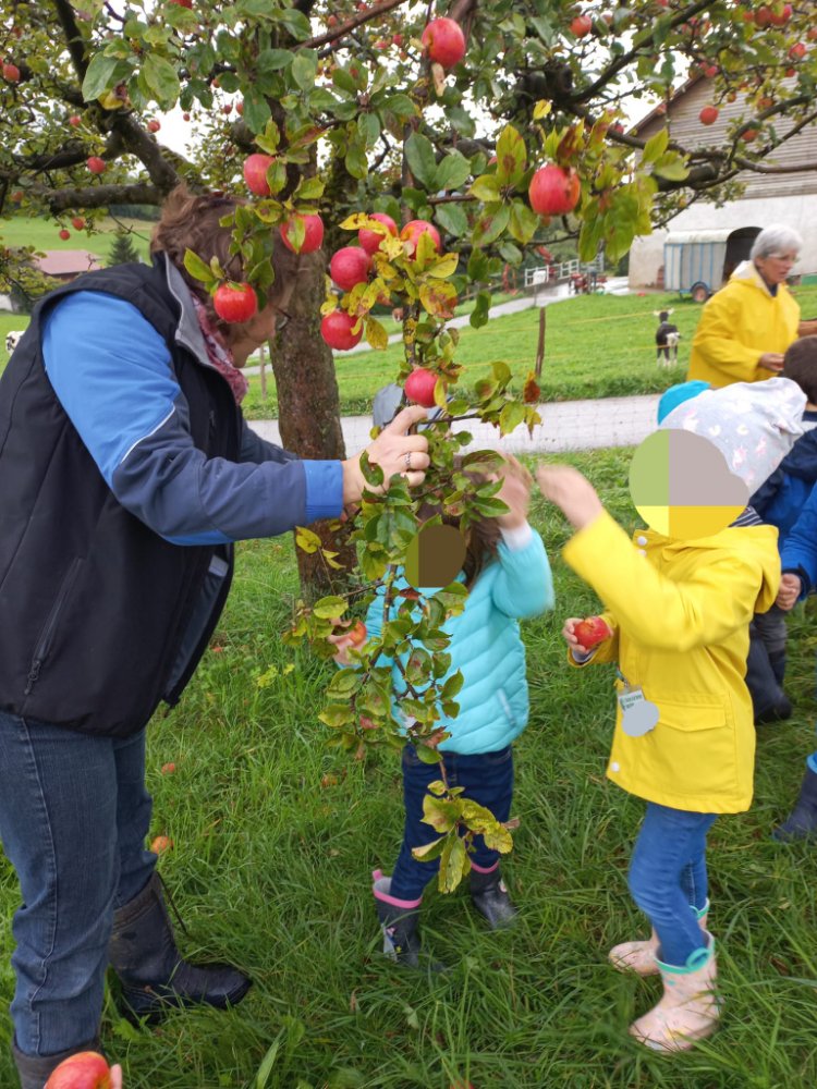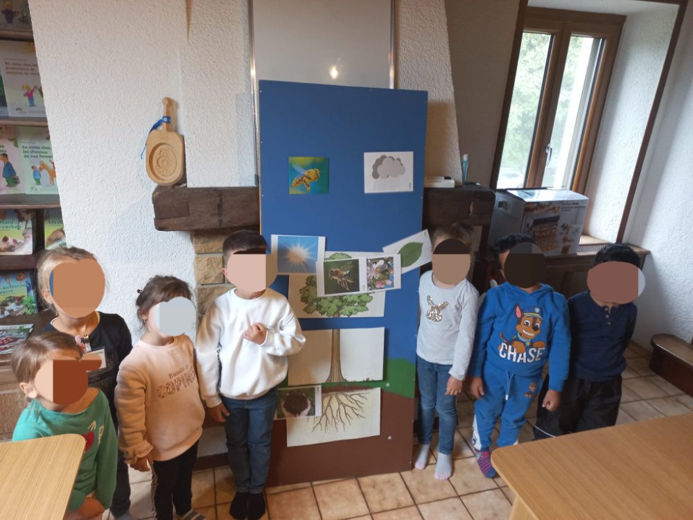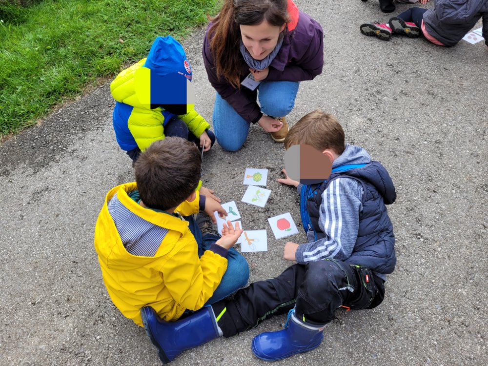 Ensuite nous faisons 2 groupes. Un groupe a parlé des arbres et de leurs besoins, en salle, par jeu imagé pendant que l’autre groupe a recherché les arbres fruitiers au verger, parfois sous la pluie ☔️, en découvrant ce qu’ils produisent et comment les manger 🥧. Puis nous avons échangé les groupes.