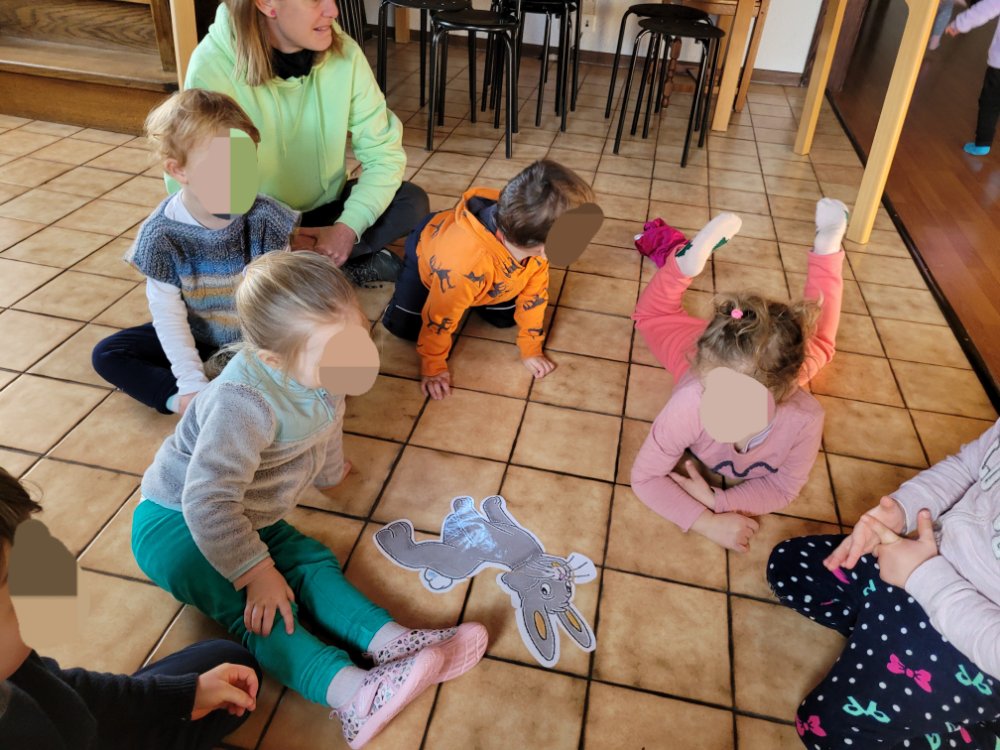 Une fois les pommes et les bananes mangées, le lait bu, nous faisons quelques jeux sur le thème du lapin.
