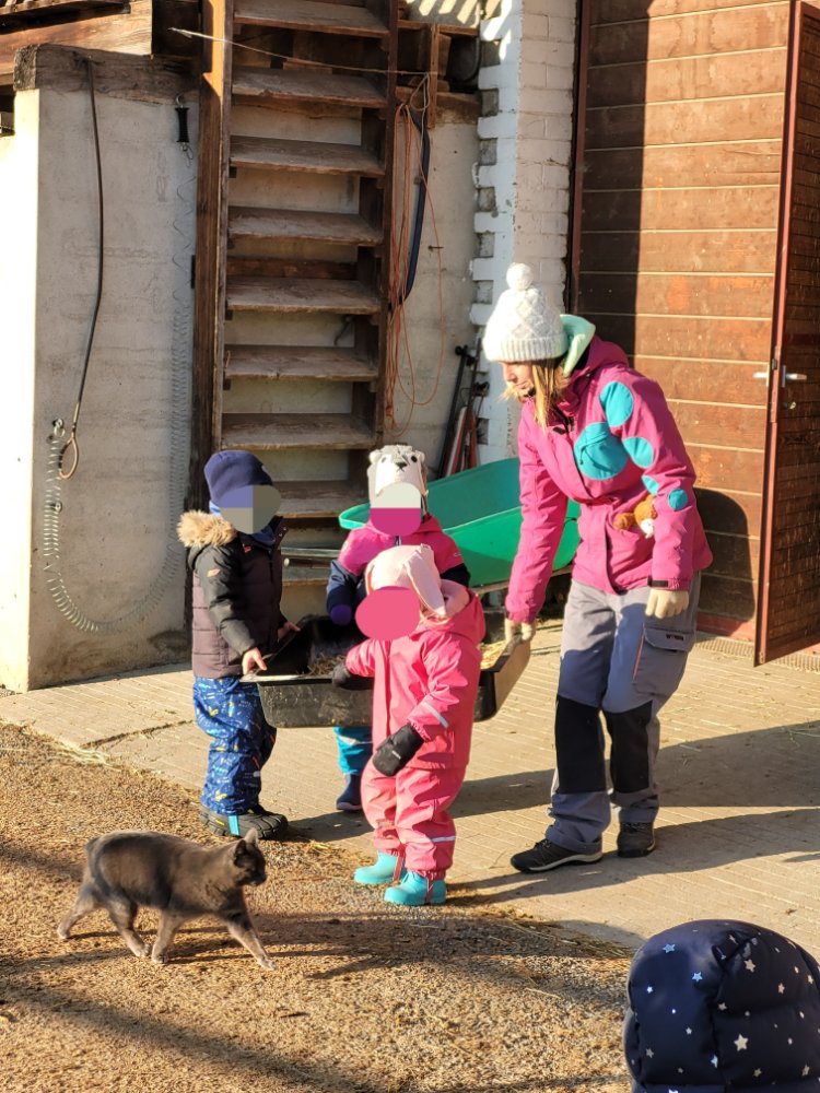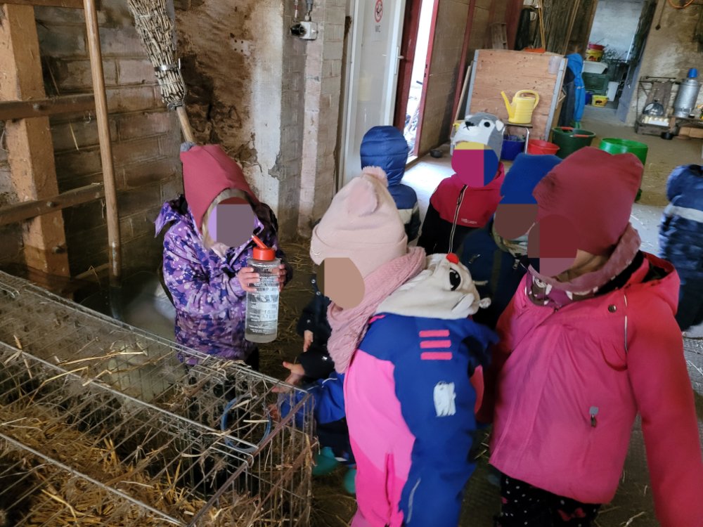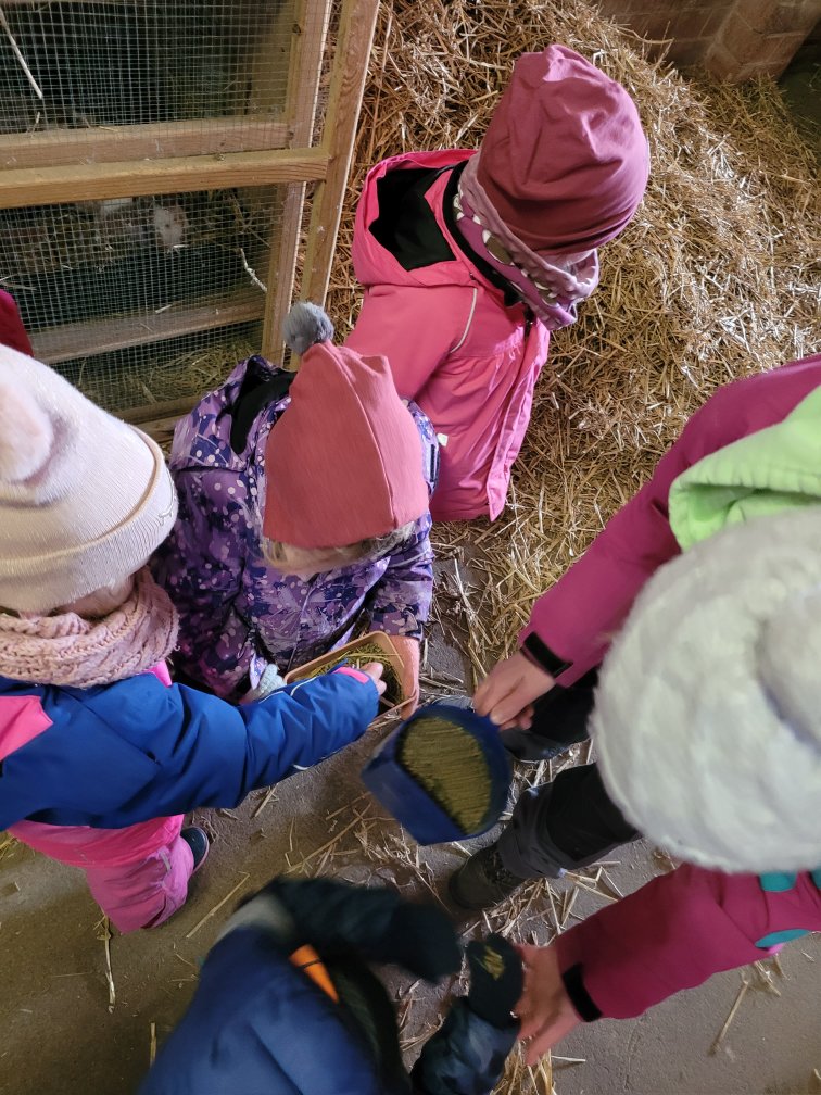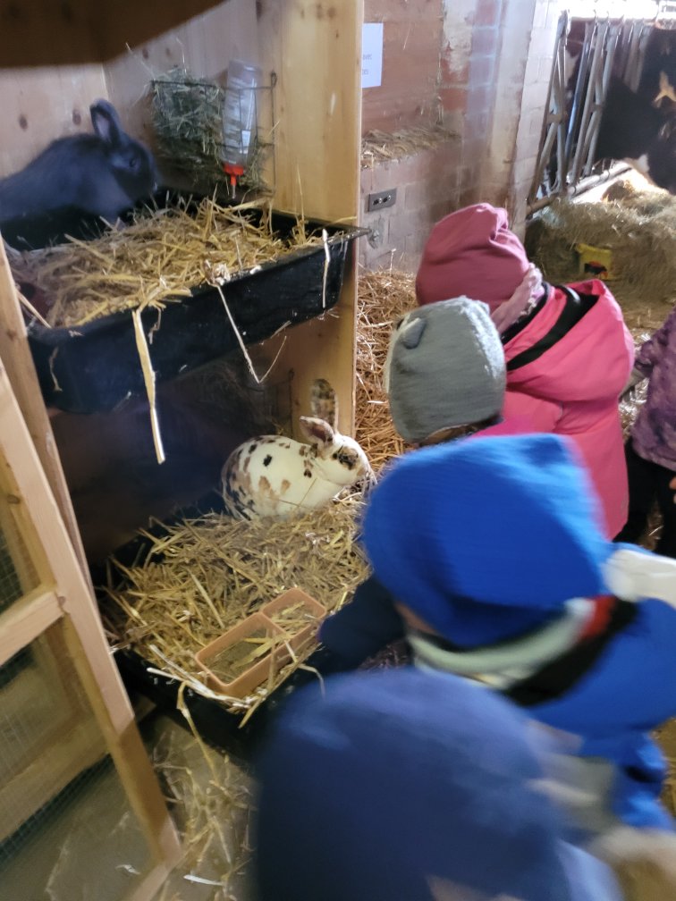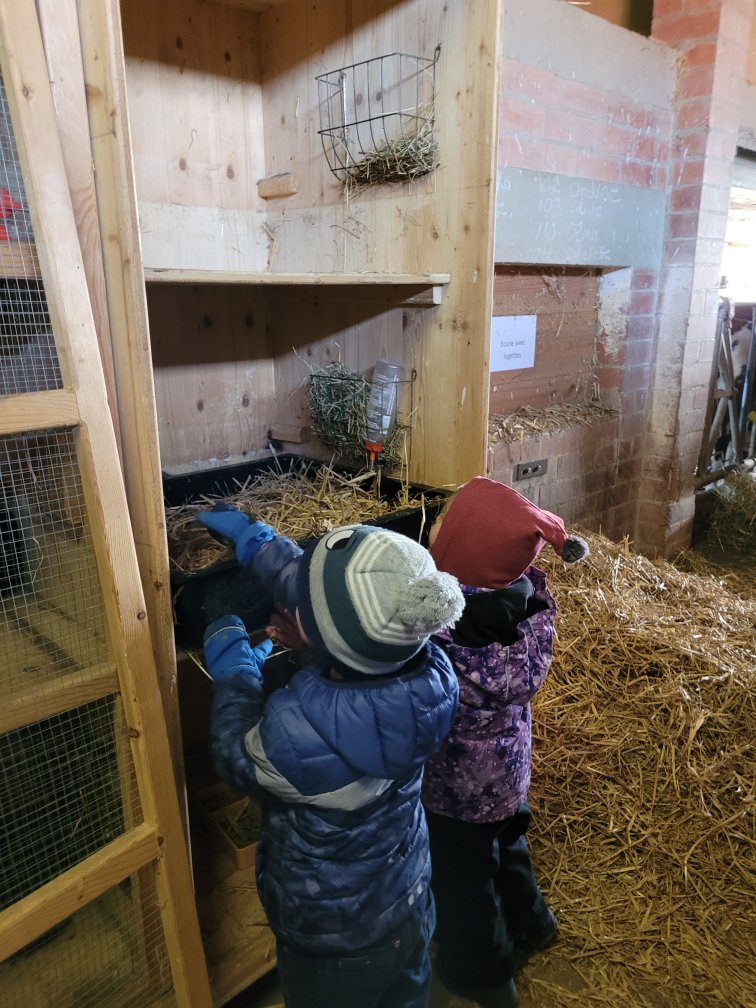 Maintenant que les lapins sont au propre, nous leur donnons à manger. J’explique aux enfants où il faut mettre les grains et le foin. Les enfants sont juste heureux de pouvoir le faire par eux même. Nous allons également remplir les bouteilles d’eau fraîche. Sans oublier de leur faire des câlins!! 😍
