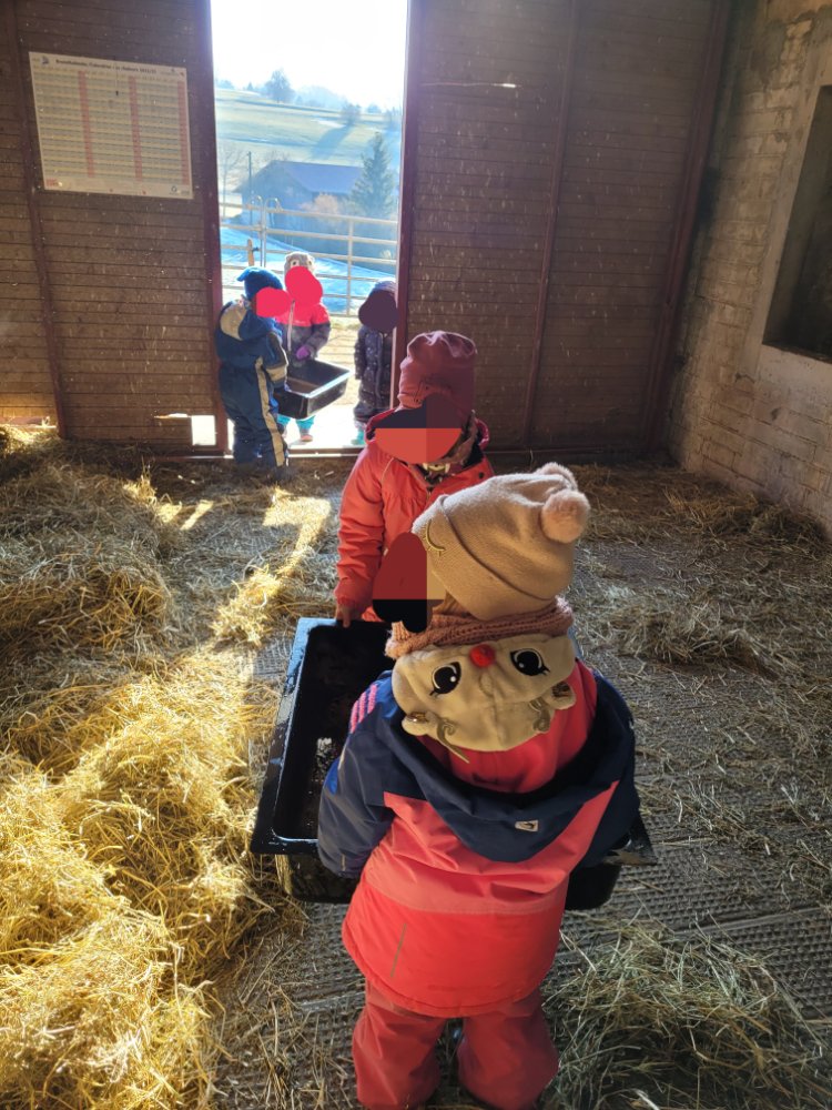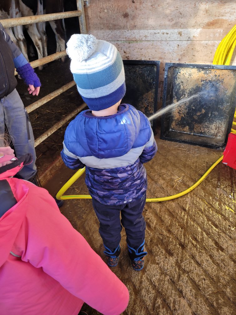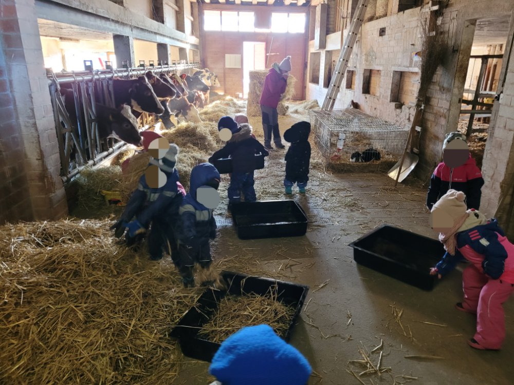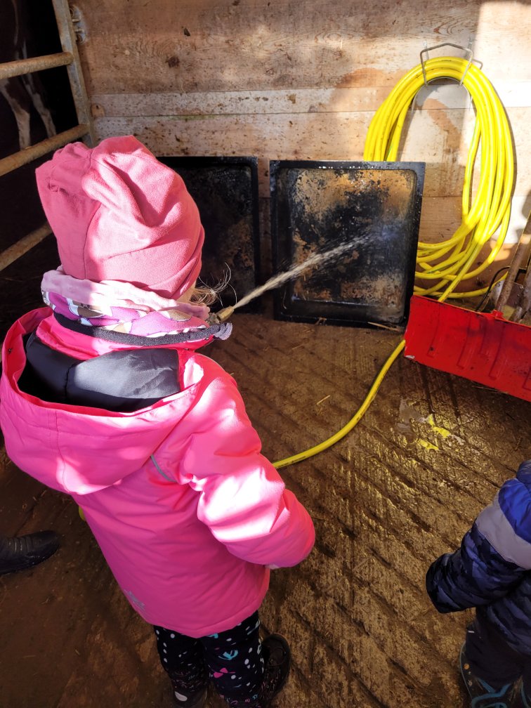 Nous avons commencé par nettoyer leur bac. Par groupe de 2 ou 3, les enfants ont porté les bacs jusque dehors. Je les ai vidé sur la fumière puis les enfants qui le souhaitaient, pouvaient les gicler avec le jet d’eau. Ensuite, nous avons ramené les bacs à la grange. Les enfants y ont mis de la paille puis chaque lapin à retrouvé une litière toute propre. 🥰